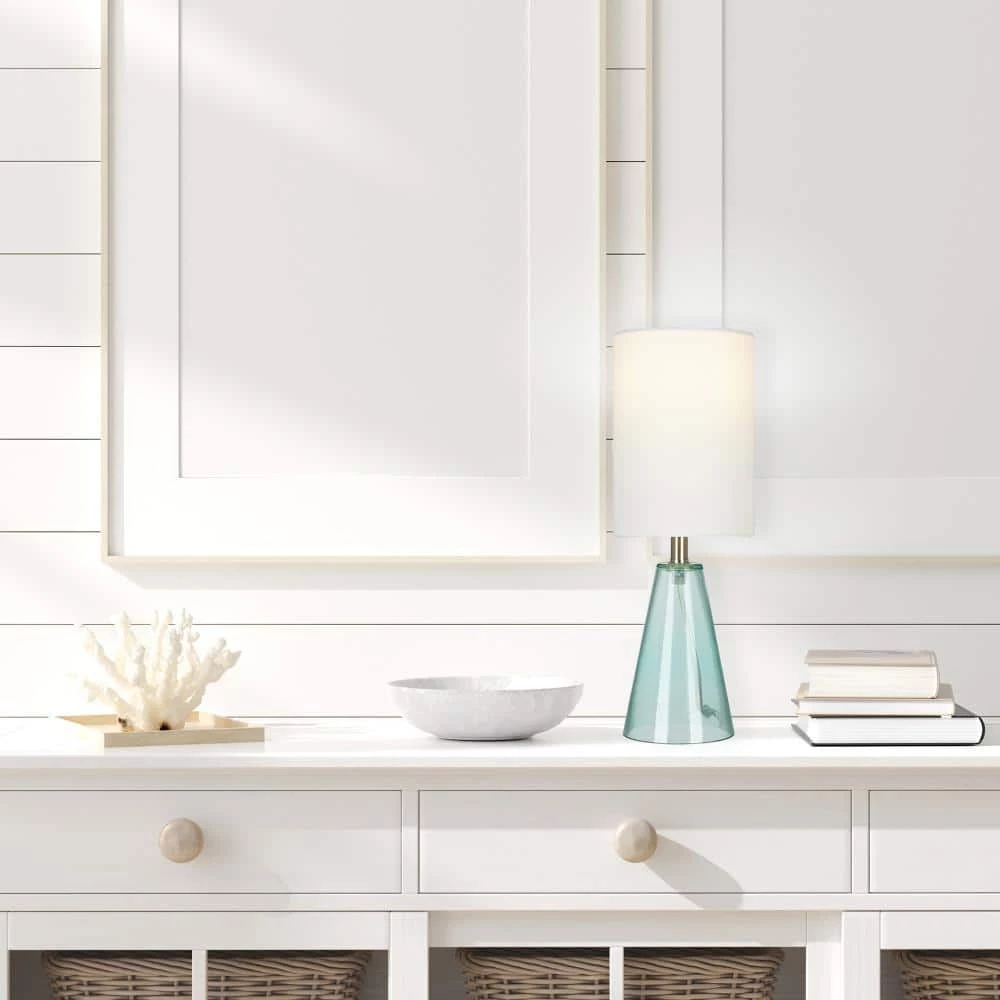 This 14 in. coastal inspired table lamp features a fluted teal glass body with a white linen drum shade. It’s sleek design and compact size make this the perfect addition to any room in your home. Updating the light fixtures in your home is the most effective way to accomplish an alluring, yet simple, DIY remodel.