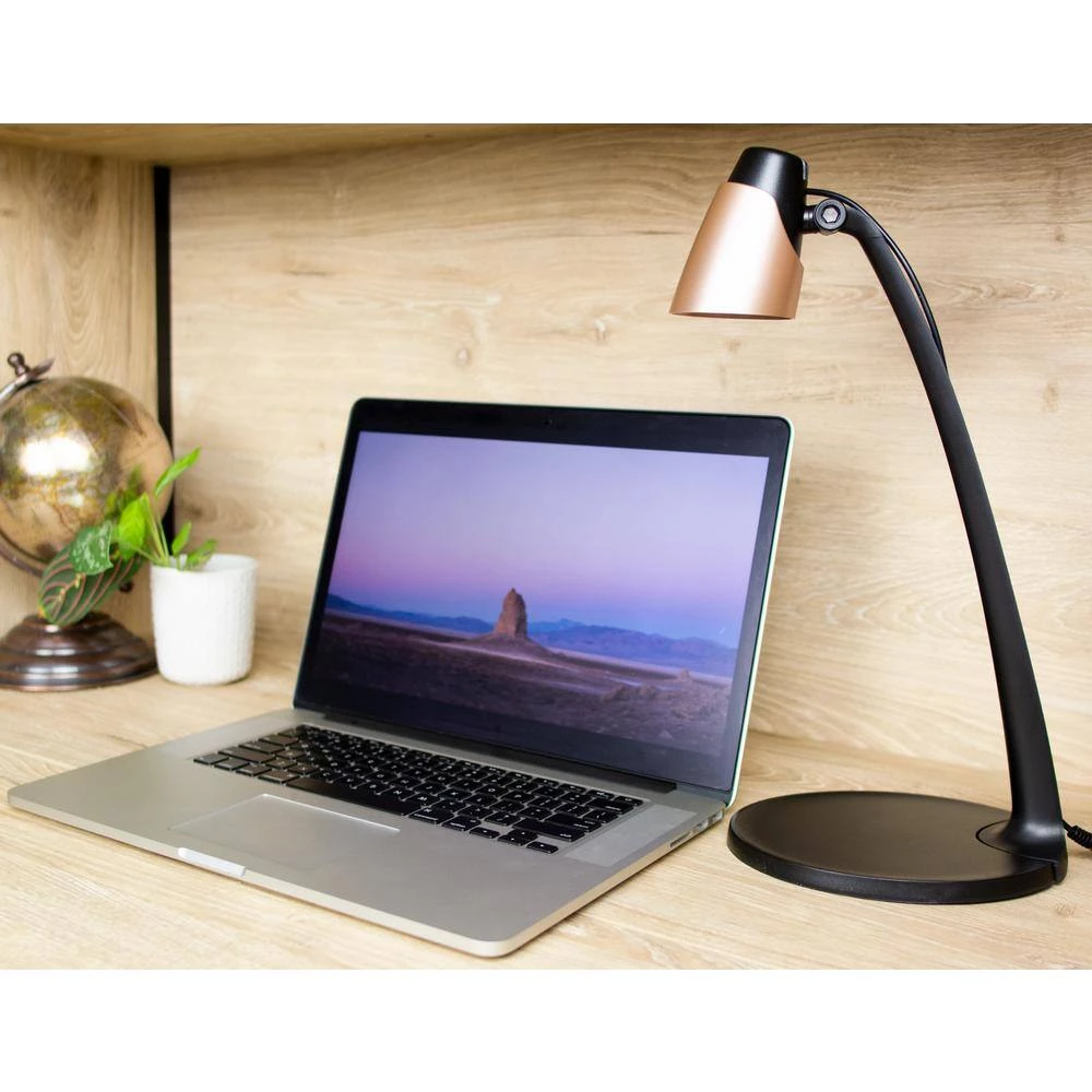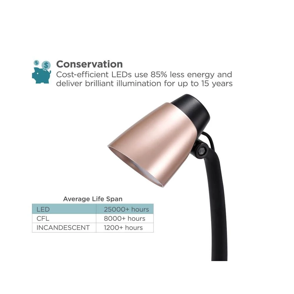 This rose gold LED desk lamp is modern and metallic. Providing crystal clear, full-spectrum lighting, this Black Decker lamp gives a modern touch to any environment you invite it into. House it in any office, dorm space, bedroom or craft area for cost-efficient lighting. It helps reduces eyestrain as it mimics natural daylight. With a long, minimalist lamp arm, this modern desk light is topped off with metallic rose gold lamp shade.3-Year Limited. Features: 250 Lumens, 3. 5 Watts – Metallic rose gold lamp shade – Mimics natural daylight – Flicker-free + cost-efficient.