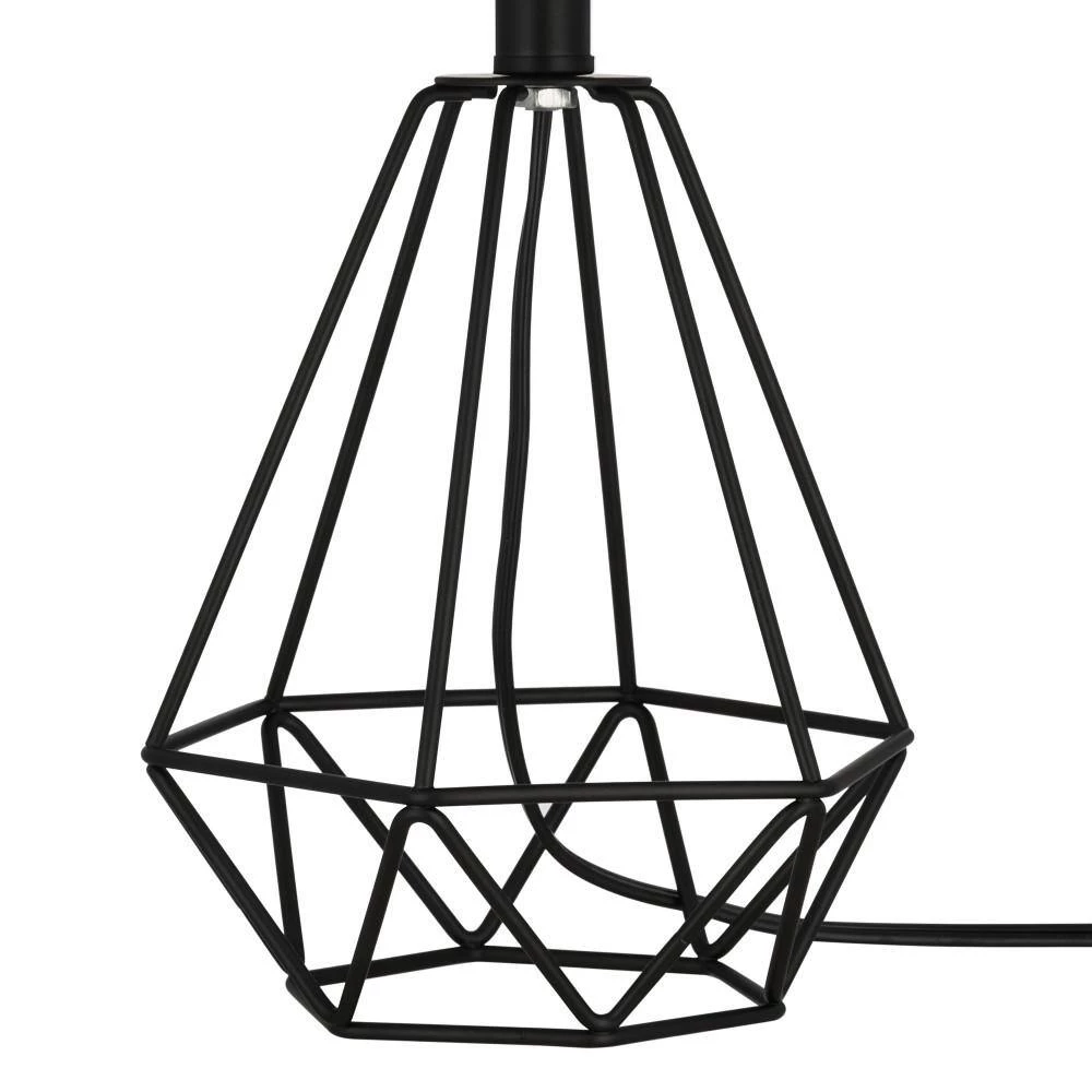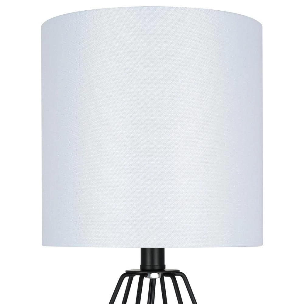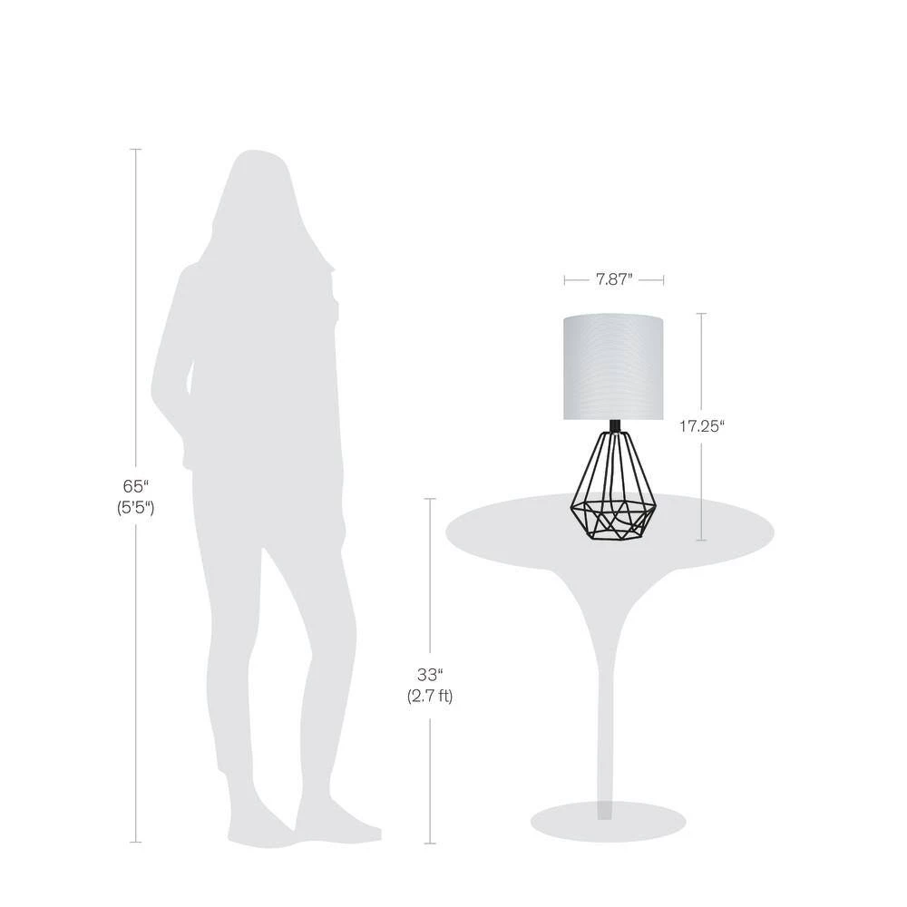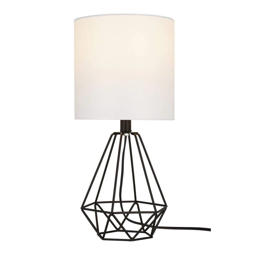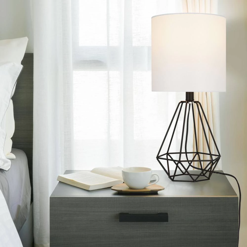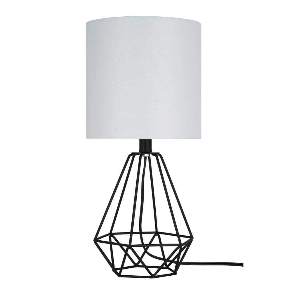 - Transitional table lamp features a geometric metal cage body in a matte black finish, topped with a white linen drum shade, ideal for adding a touch of style to any nightstand, desk or side table