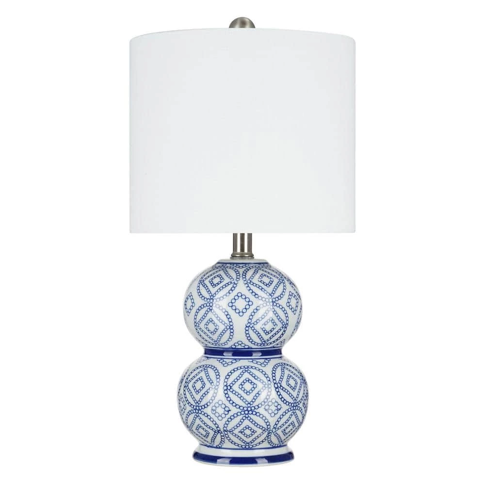Add an element of sophistication and elegance to your home decor with this blue and white Chinoiserie Ceramic Table Lamp. The ceramic base with geometrically painted designs, along with a classic white linen shade (10 in. W x 8.5 in. H), creates a modern look with rustic flare. This item comes with a classic On/Off rotary switch located directly on the socket. For your convenience, this product also comes with an energy-efficient, cost-saving 9-Watt, warm white (2700 kelvin) LED bulb. Intended for indoor use. 1-year warranty included.