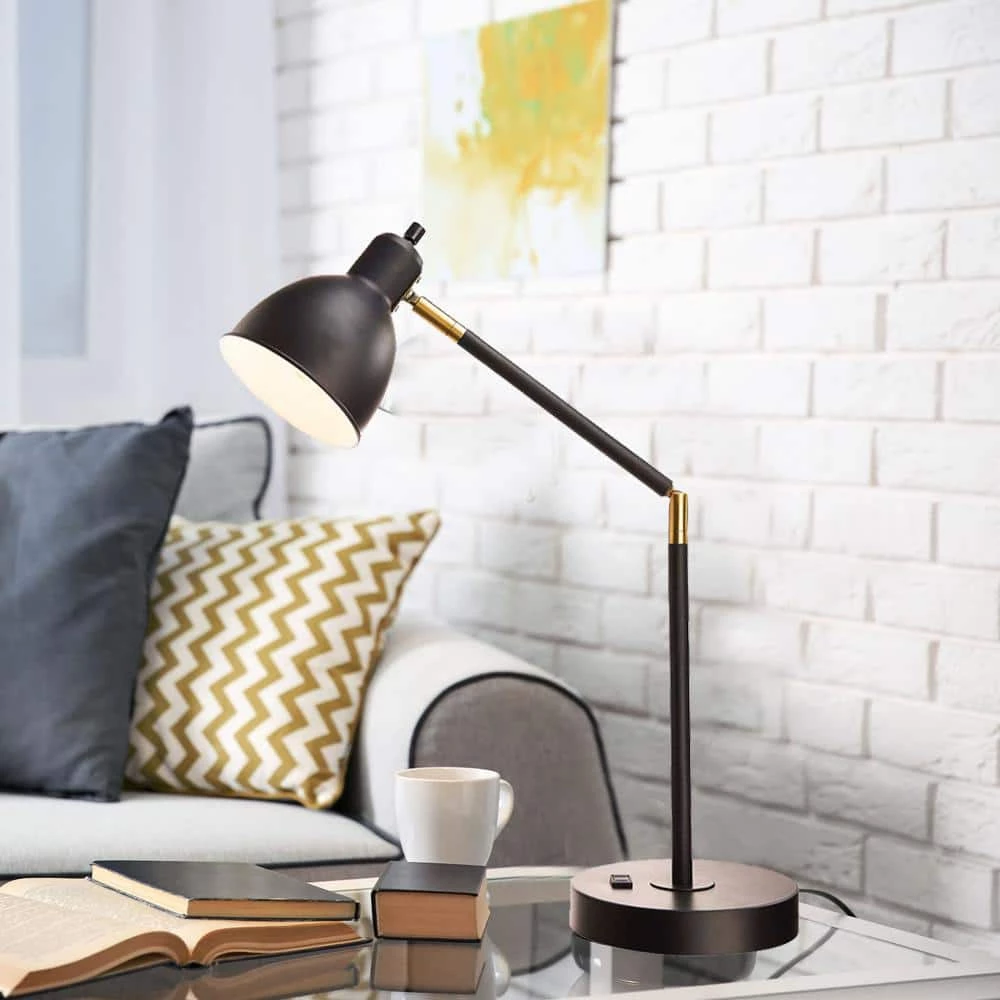 Compact. Efficient. Functional. The Brass Adjustable Desk Lamp features a smooth black metal finish with antique brass accents, lending distinction to your workspace or study. An adjustable arm and lamp shade offer optimal directional lighting. The AC power outlet built into the base is convenient for charging electronics. Enjoy a 1-year warranty against defects in materials and workmanship from Tensor, the market leader in functional lighting since 1959.