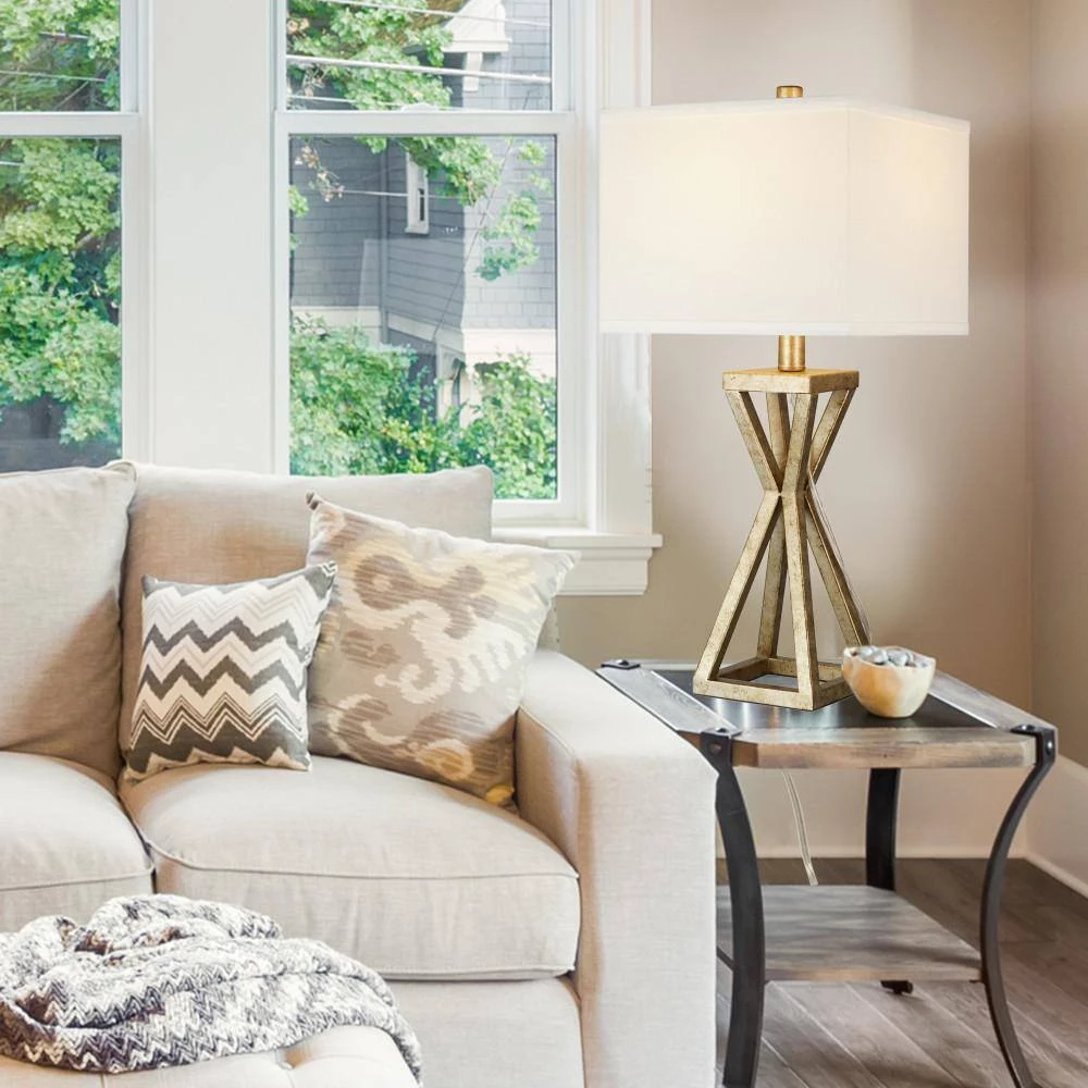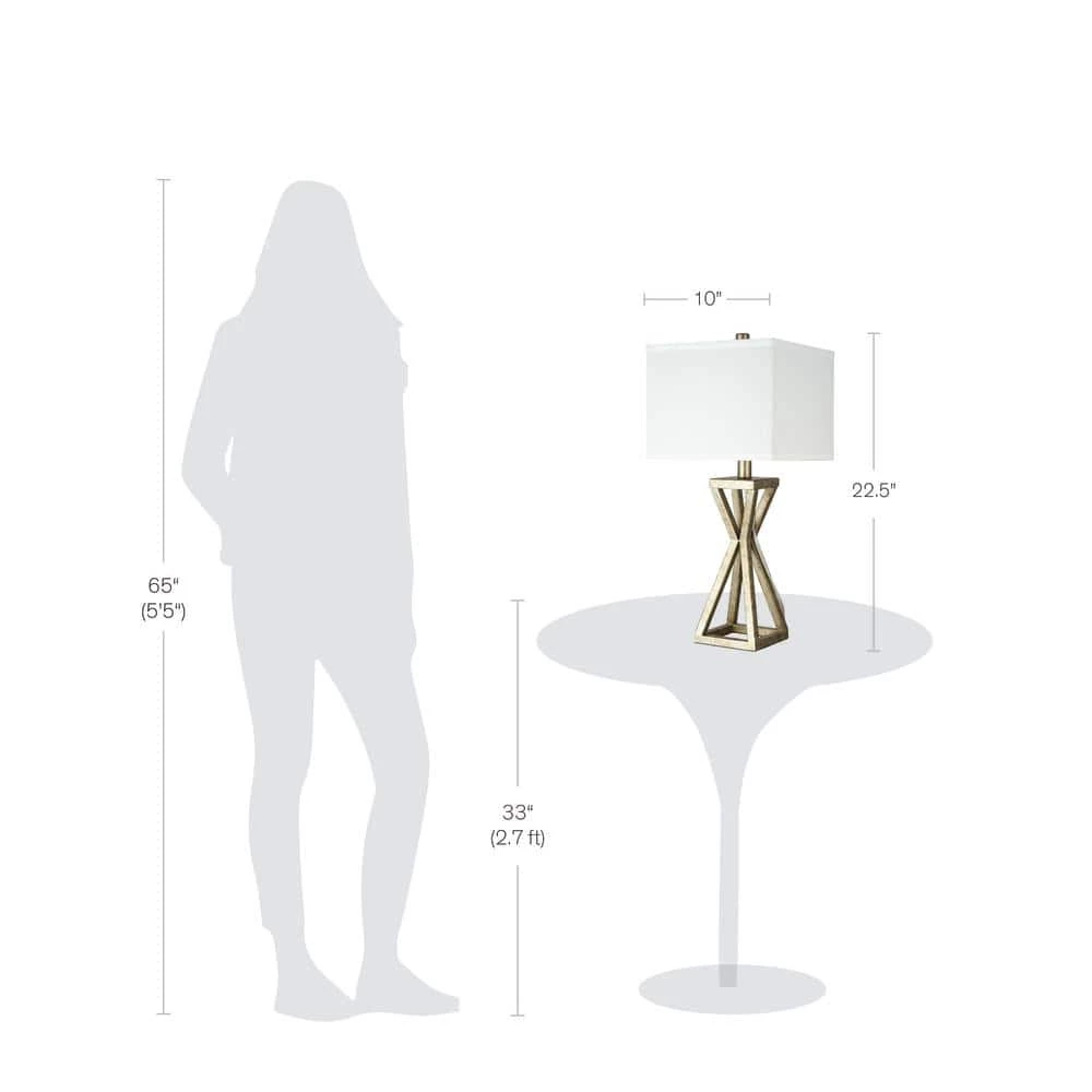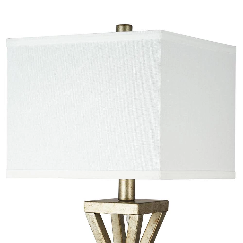 This 22.5 in. transitional table lamp features a geometric base design with a hand painted silver leaf finish and white linen rectangular shade is the perfect finishing touch to your bedroom as a bedside lamp, living room, family room or den. Updating the light fixtures in your home is the most effective way to accomplish an alluring, yet simple, DIY remodel.