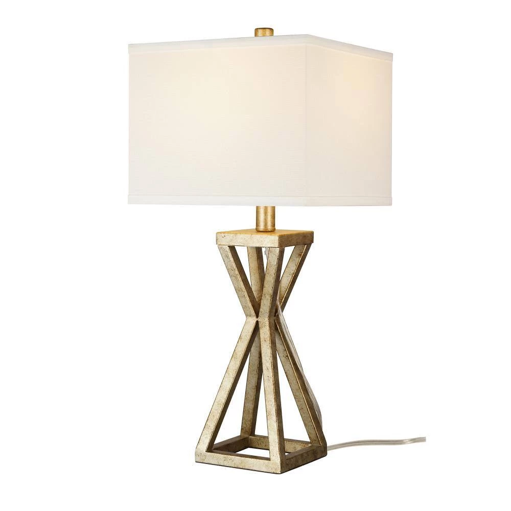 - Transitional 22 in. table lamp features a geometric base design with a hand painted silver leaf finish and white linen rectangular shade