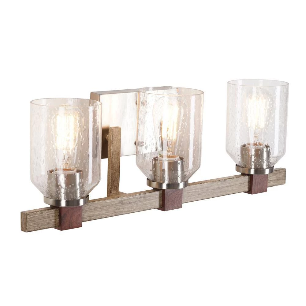 Modern and rustic details contrast beautifully in this stunning 3-Light Bathroom Vanity with Seeded Glass Shades that mixes dark walnut wood, brushed nickel and glass shade details. This hardwired vanity is a truly unique fixture made from durable steel and features two finishes: modern brushed nickel and rustic walnut wood. Three clear glass shades are flecked with beautiful air bubble details inspired by running river water. Uses three standard A19 E26 light bulbs (not included). Clear or Edison-style LED filament bulbs recommended to complement the fixtures’ rustic look. Fixture can be hung in an up or a down position for versatility. This light is sure to be a conversation piece and because of its wonderfully layered look and will complement home decor styles from modern farmhouse to coastal, vintage to contemporary.