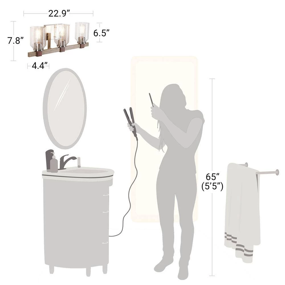 - Modern farmhouse 3-light vanity features a 2 tone wood finish paired with brushed nickel hardware