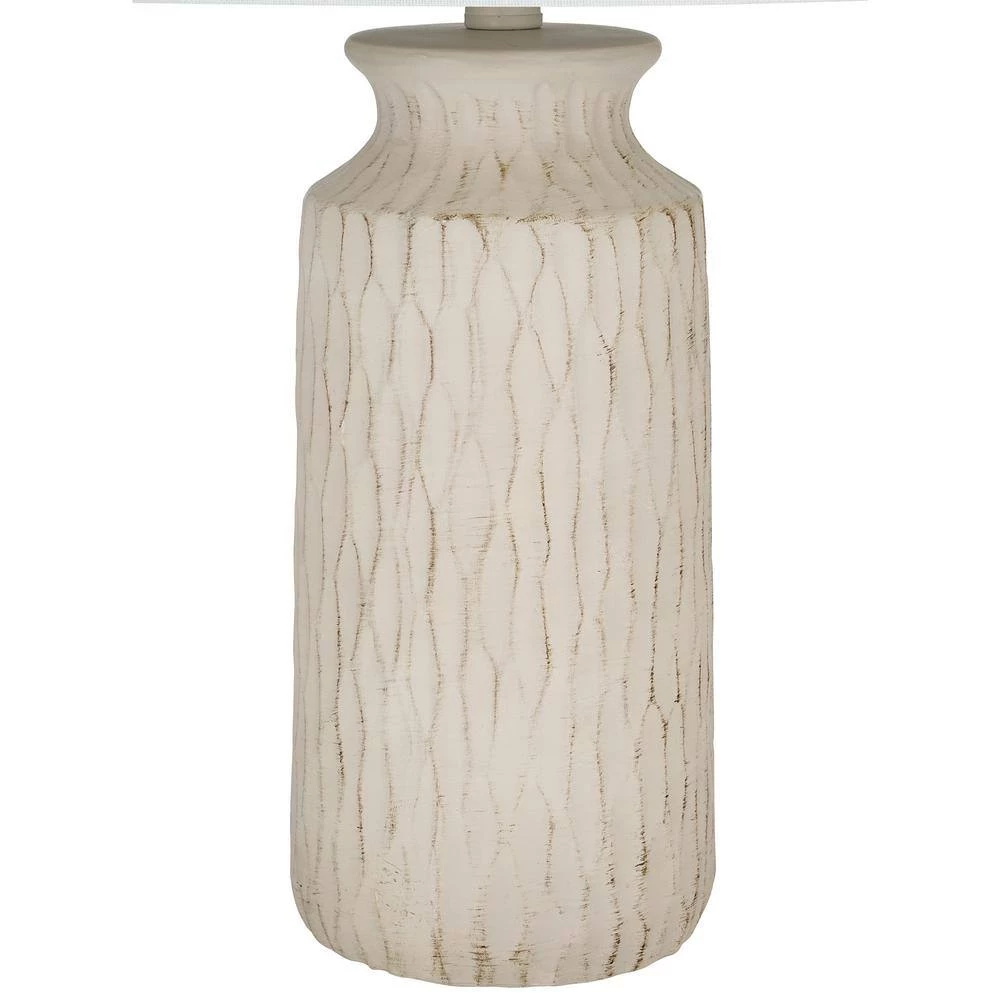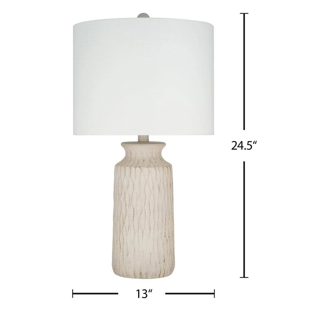 This farmhouse-inspired Resin Table Lamp in Beige with its matte textured finish is the perfect addition to any of your living spaces. With a classic white linen drum shade to cast ambient light (13 in. W x 10 in. H), this lamp is an earthy yet elegant choice. This product is easy to use with a convenient On/Off rotary switch located directly on the socket. For your convenience, this lamp comes with one 60-Watt incandescent or LED equivalent bulb. The bulb is an energy-efficient, cost-saving 9-Watt, warm white (2700 kelvin) LED bulb. Simple assembly in less than 15-minutes. Intended for indoor use only. 1-year warranty included.