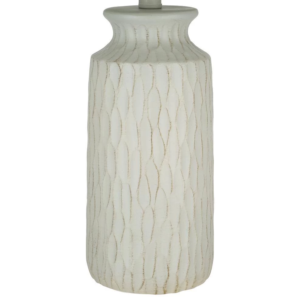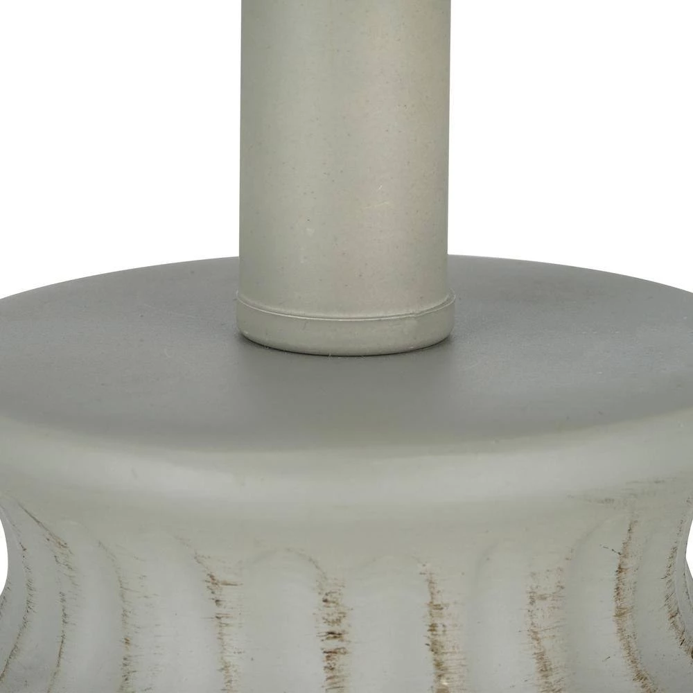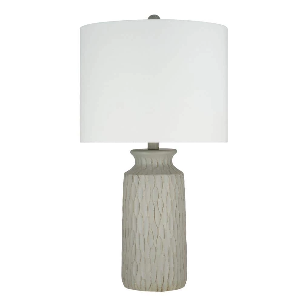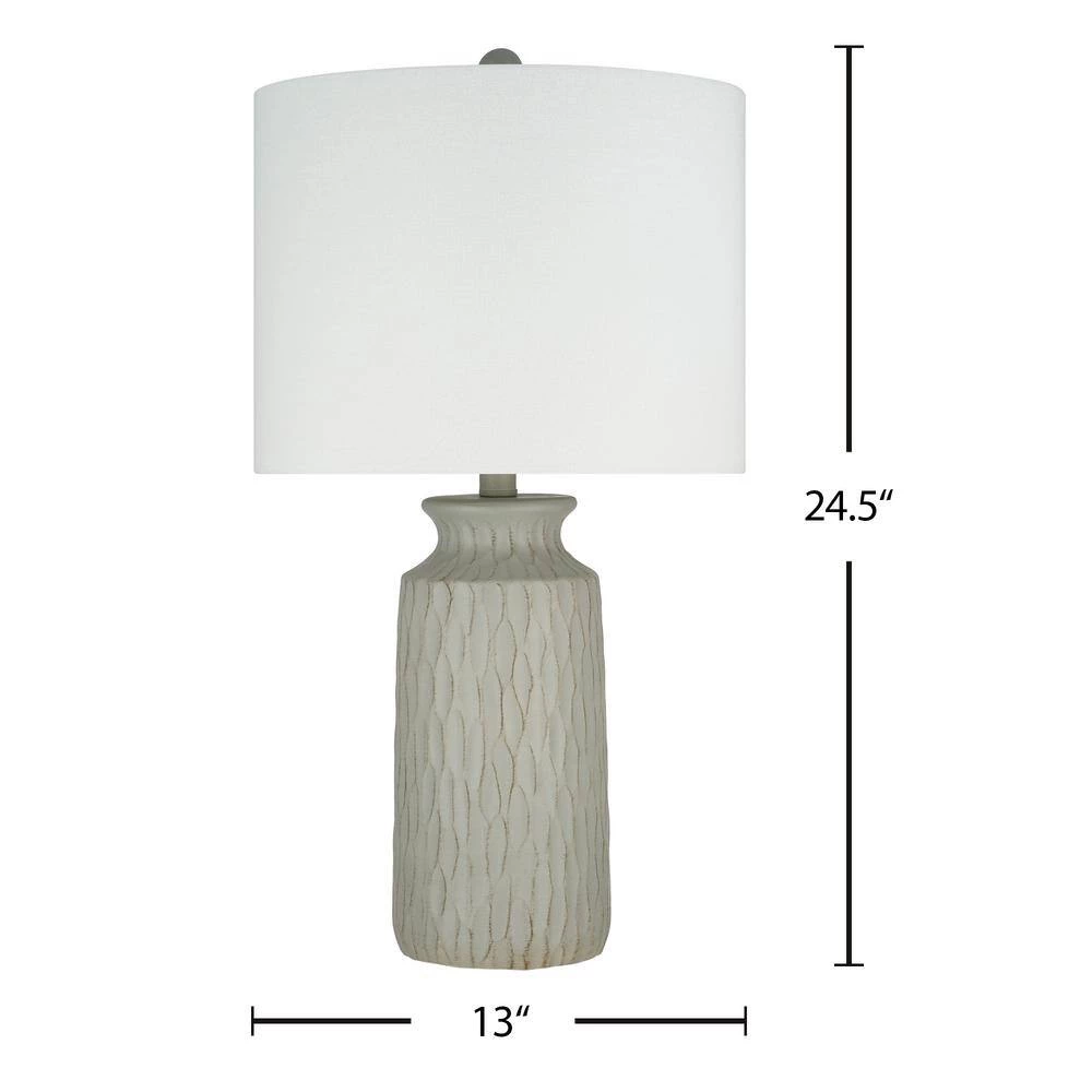 This farmhouse-inspired Resin Table Lamp in Grey with its matte textured finish is the perfect addition to any of your living spaces. With a classic white linen drum shade to cast ambient light (13 in. W x 10 in. H), this lamp is an earthy yet elegant choice. This product is easy to use with a convenient On/Off rotary switch located directly on the socket. For your convenience, this lamp comes with one 60-Watt incandescent or LED equivalent bulb. The bulb is an energy-efficient, cost-saving 9-Watt, warm white (2700 kelvin) LED bulb. Simple assembly in less than 15-minutes. Intended for indoor use only. 1-year warranty included.
