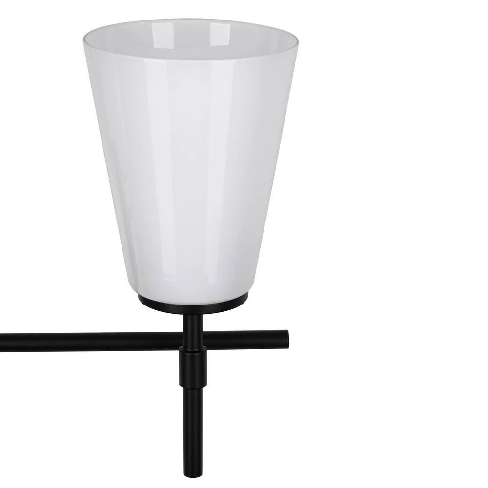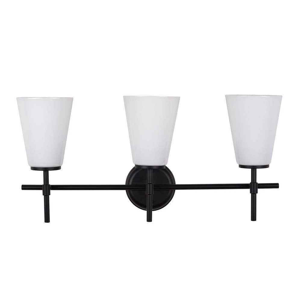Clean design and simple, modern style shine in this 3- Light Vanity. Featuring three elegant cone-shaped shades made from premium opal glass and a refined 3-armed bar design made from metal, this fixture is designed to delight and built to last. Uses three standard A19 E26 light bulbs (bulbs not included). Fixture can be mounted in either direction and is dimmable if used with standard wall dimmer switch (not included). This simply sophisticated vanity is damp-rated, making it ideal for placement in bathrooms and over sinks. Hardwired and easy to install, includes all mounting hardware and easy-to-follow instructions.