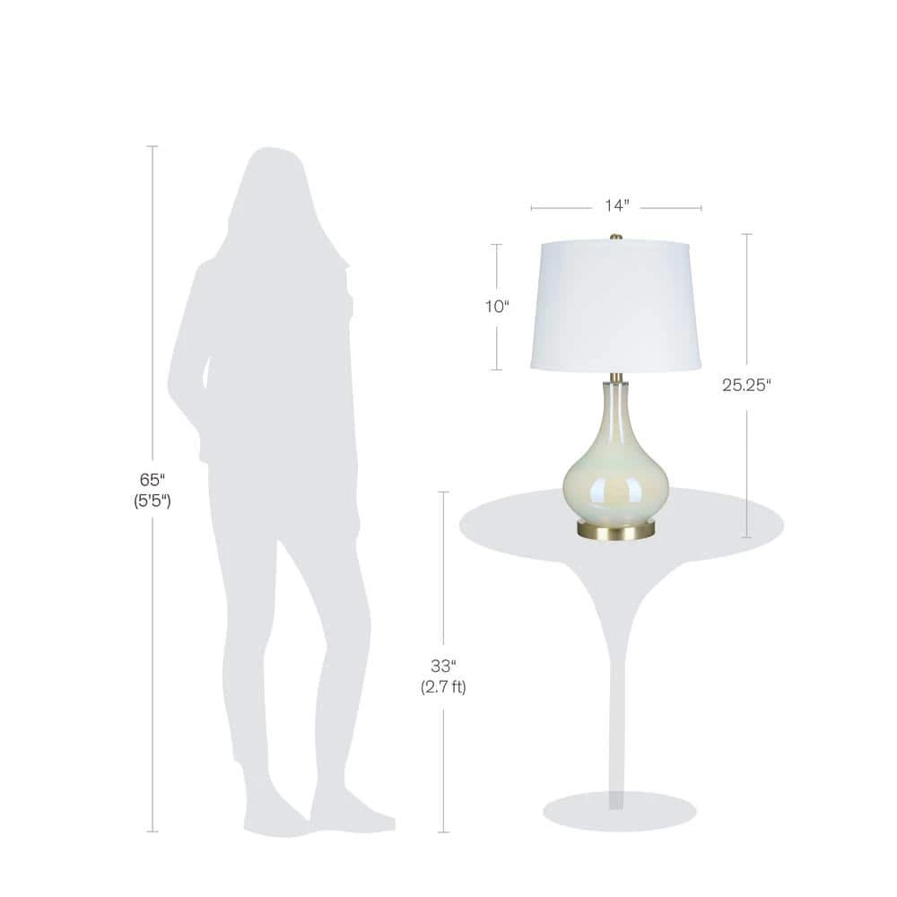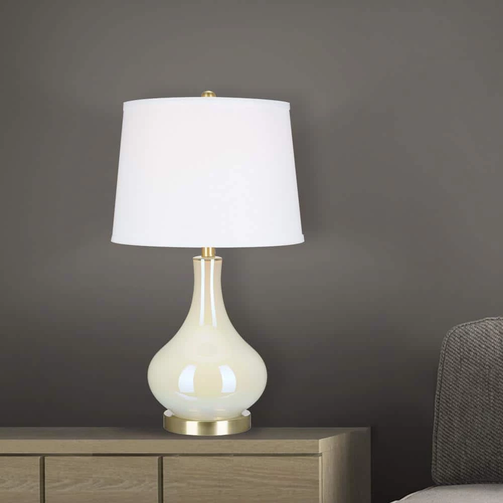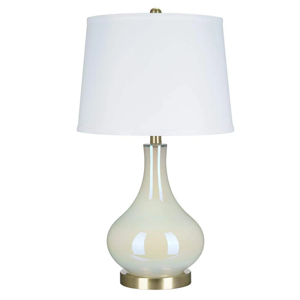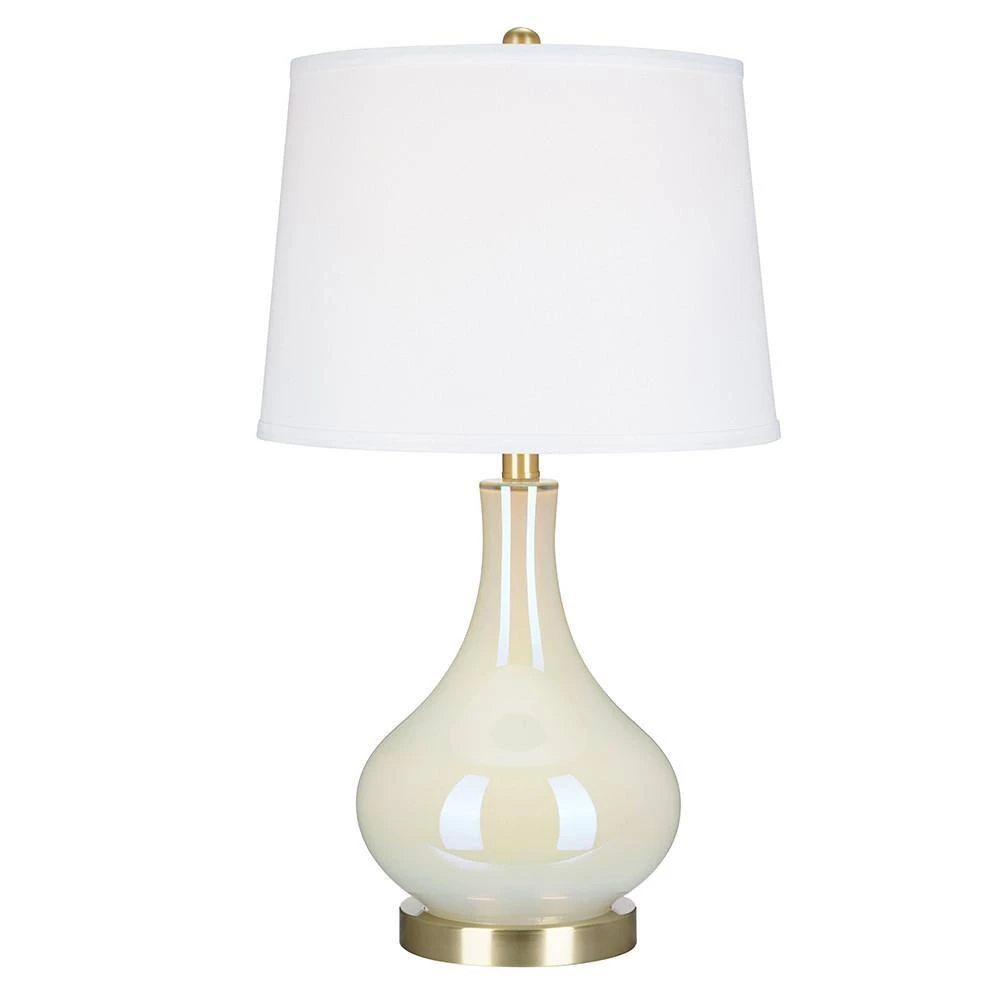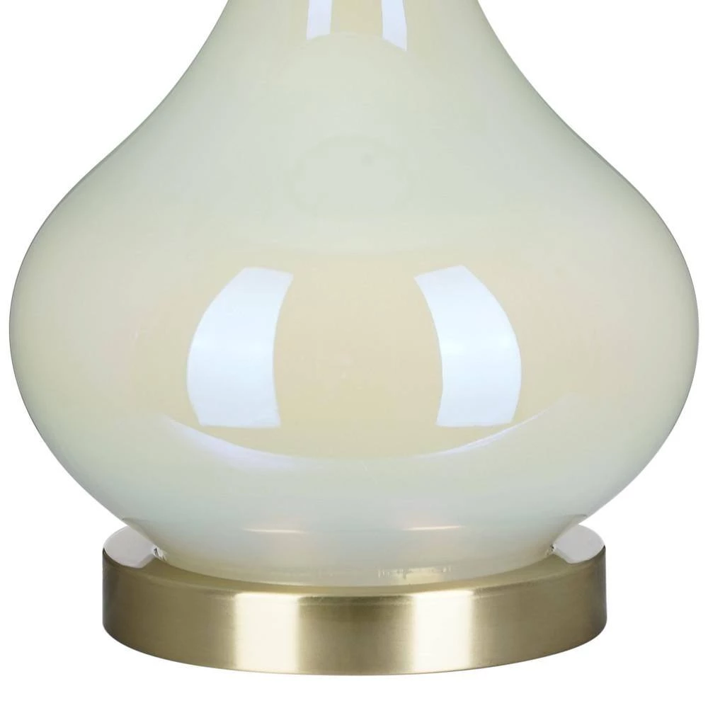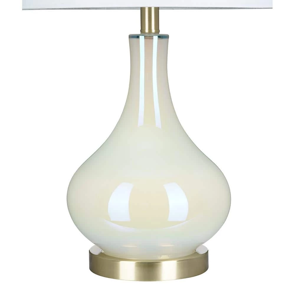 Bring a sophisticated update to any living space with this on trend gourd shaped glass table lamp. With its crisp white linen modified drum shade mixed with the white iridescent glass surface, this table lamp will add visual interest and a soft modern look to any room decor. Make a statement by pairing on side tables or bedroom nightstands.