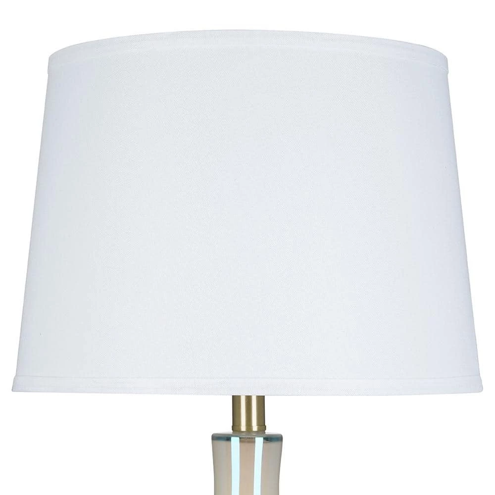 - Transitional glass table lamp brings a soft modern feel to any room with its warm iridescent white glass and antique brass accents