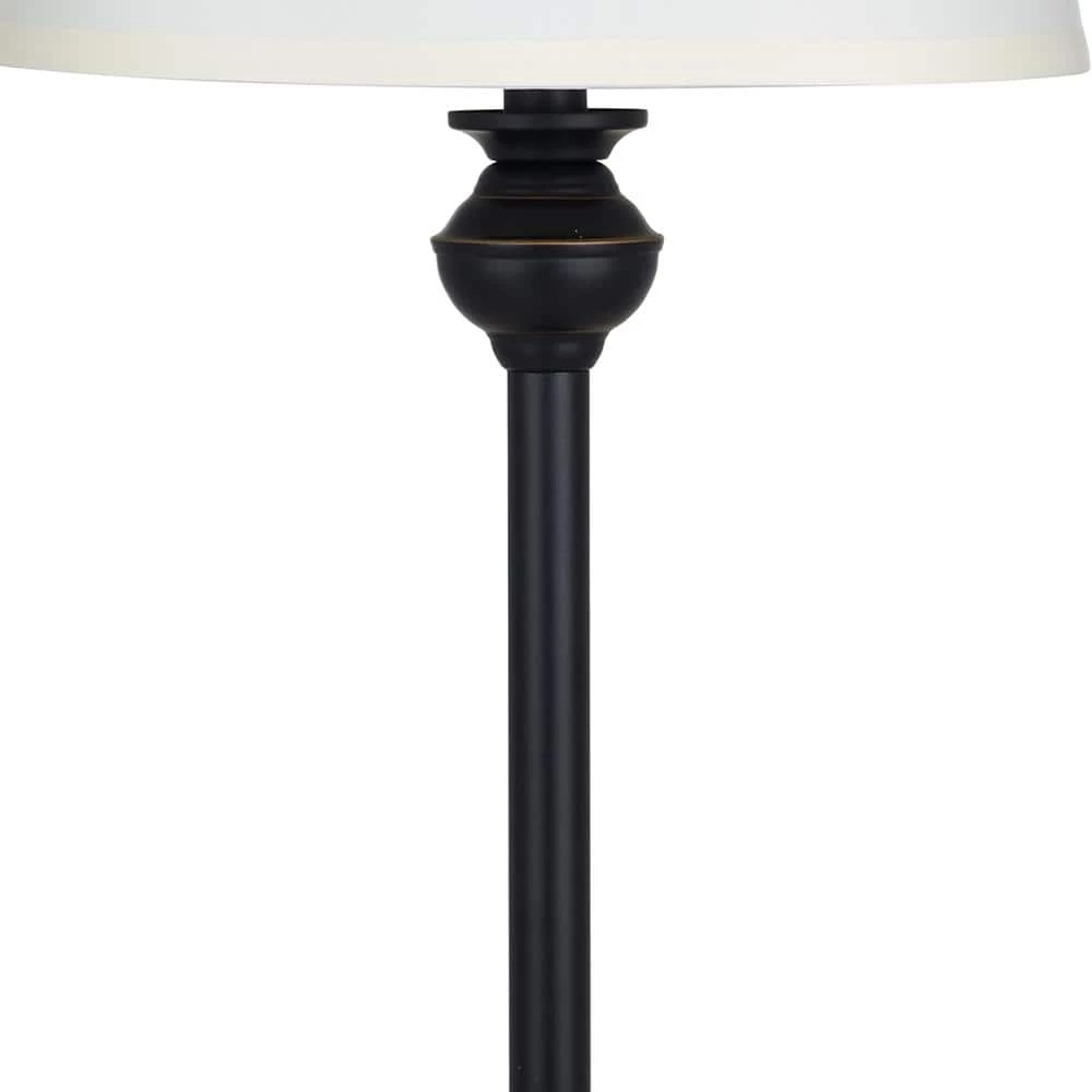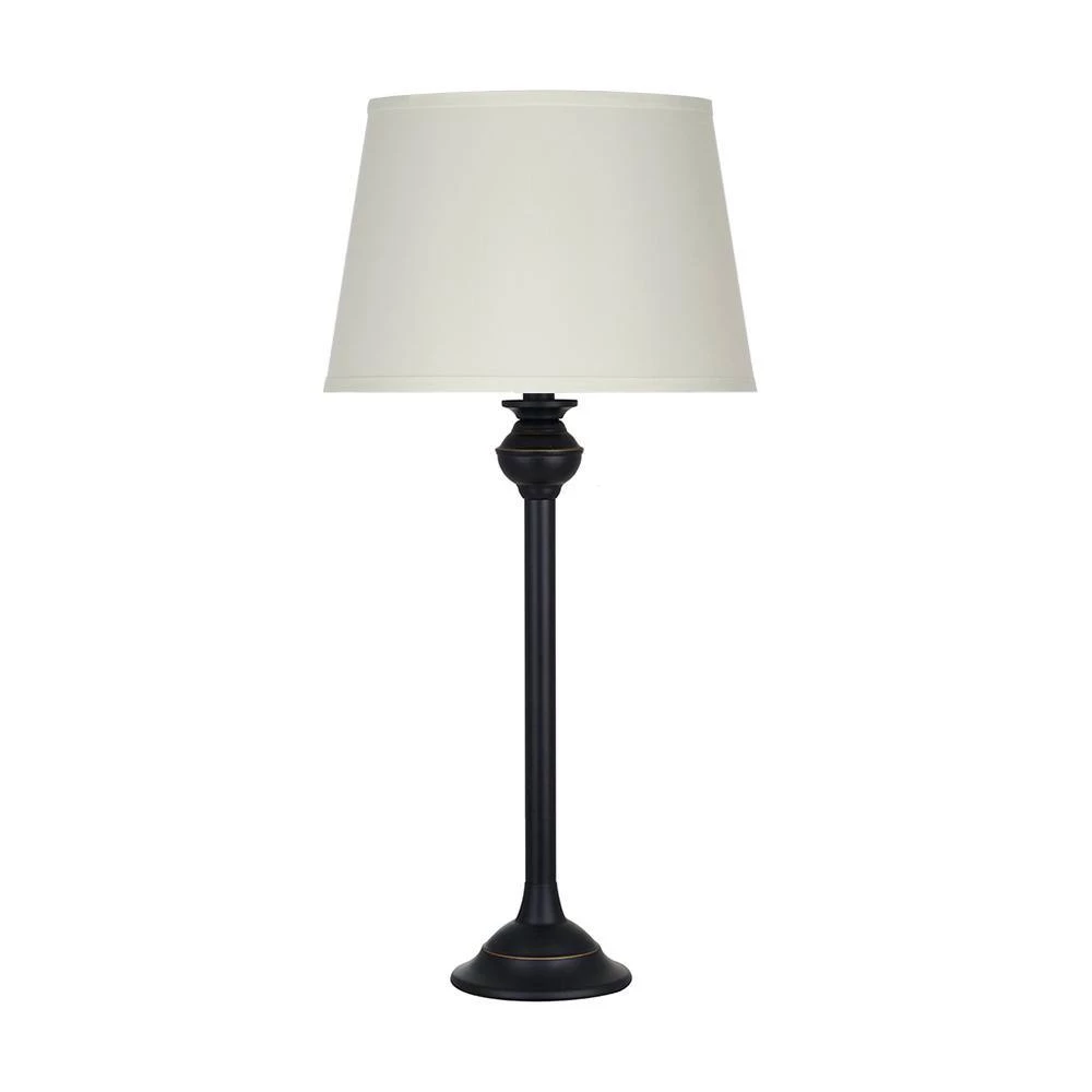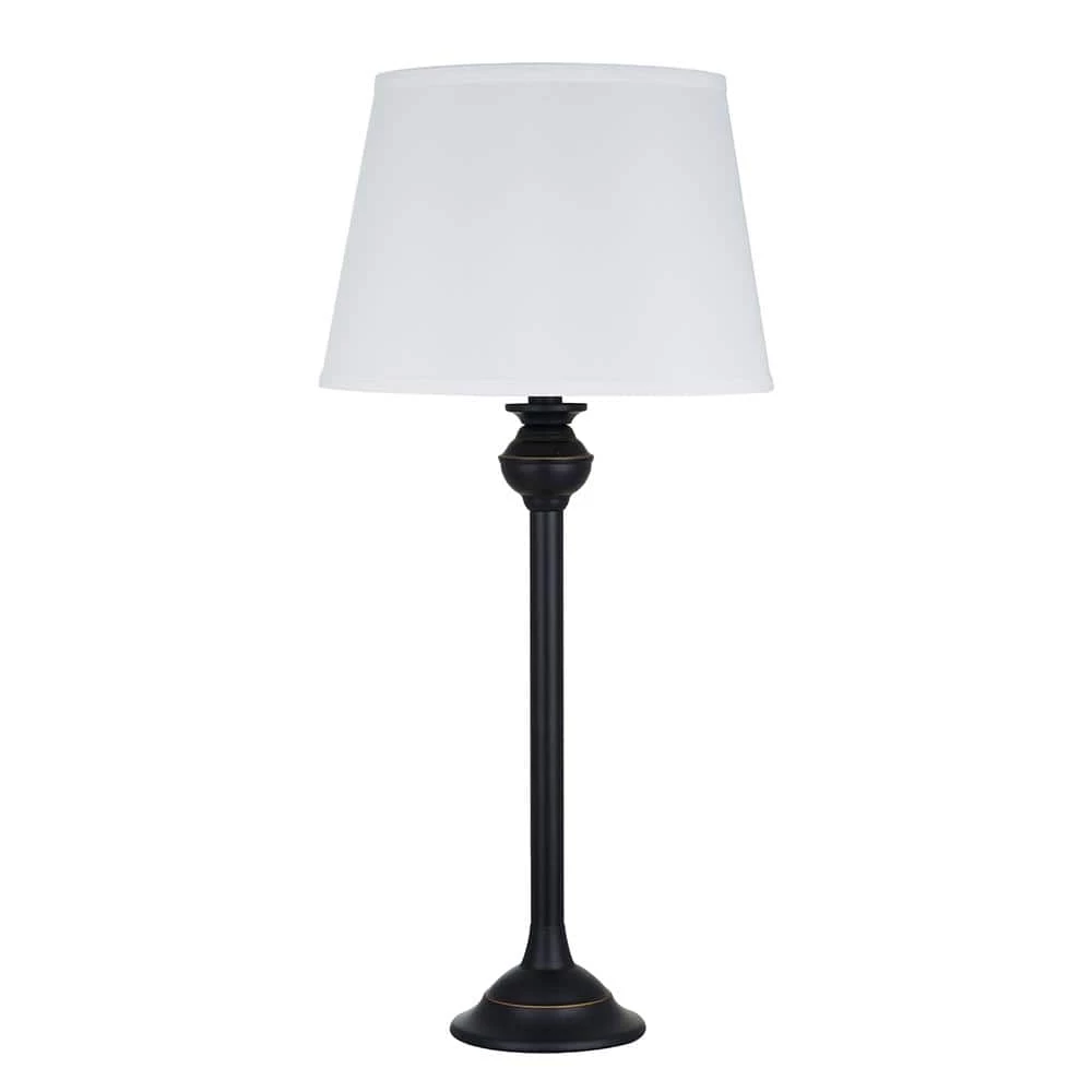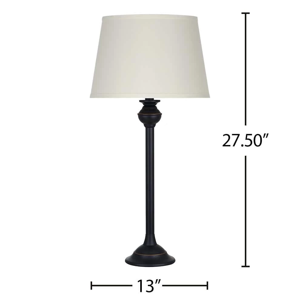 Traditional fabric shade and oil rubbed bronzed base add a touch of class to your room. Metal table lamp base with oil rubbed bronze; beige fabric shade. LED bulb included. Dimensions: 13.00 in. W x 13.00 in. D x 27.50 in. H. Assemble in 15-minutes or less.