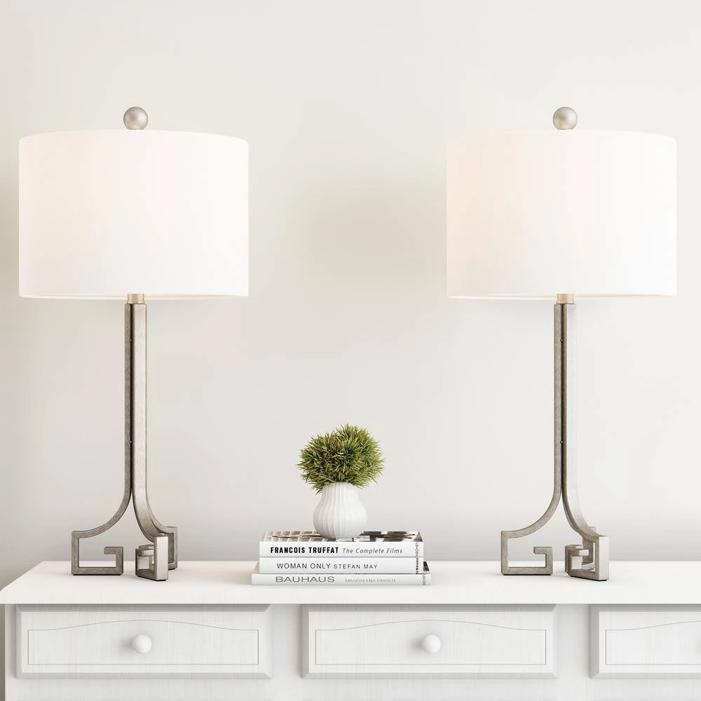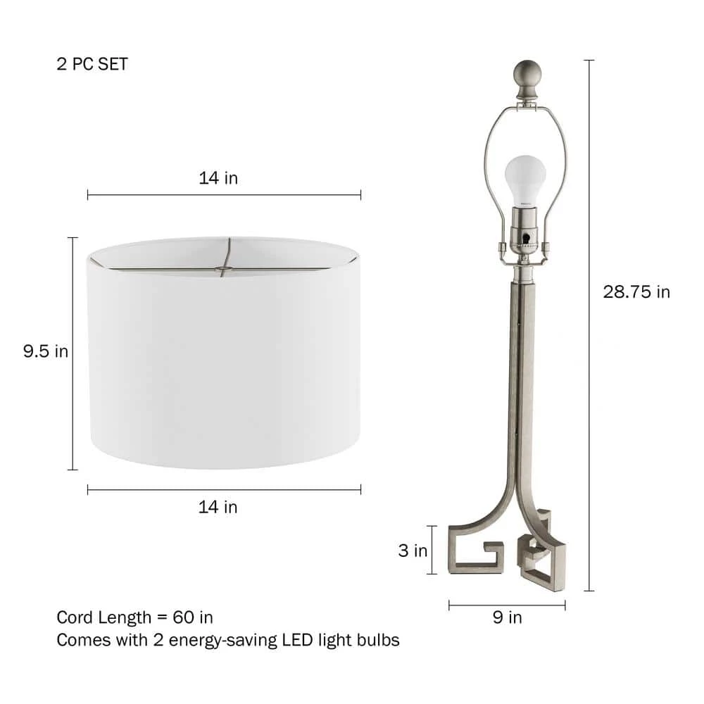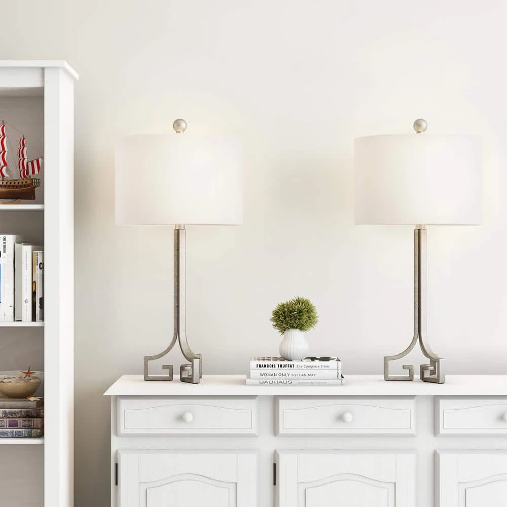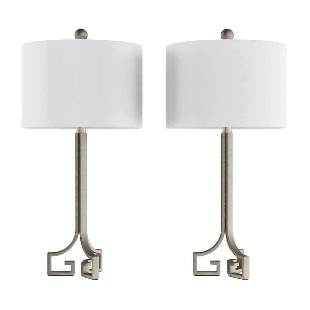 Instantly transform your space with stylish form and function, with this elegant and unique 28.75 in. Antique Silver Greek Key Design LED Table Lamps with Ivory Shades (Set of 2) from Lavish Home. With a beautiful yet sturdy tripod base that features an eye-catching antique silver finish metalwork design inspired by a popular symbol of friendship, love and unity, and crisp ivory shades, the lamps provide beautiful warm ambient lighting for your entryway, bedroom, living room, or home office. The UL-listed table lamps conveniently come with energy-saving replaceable ETL listed LED light bulbs that have a 25,000-hour lifespan. It’s a perfect matching 2-piece set that will add a unique and modern touch to the nightstands or end tables in any room.