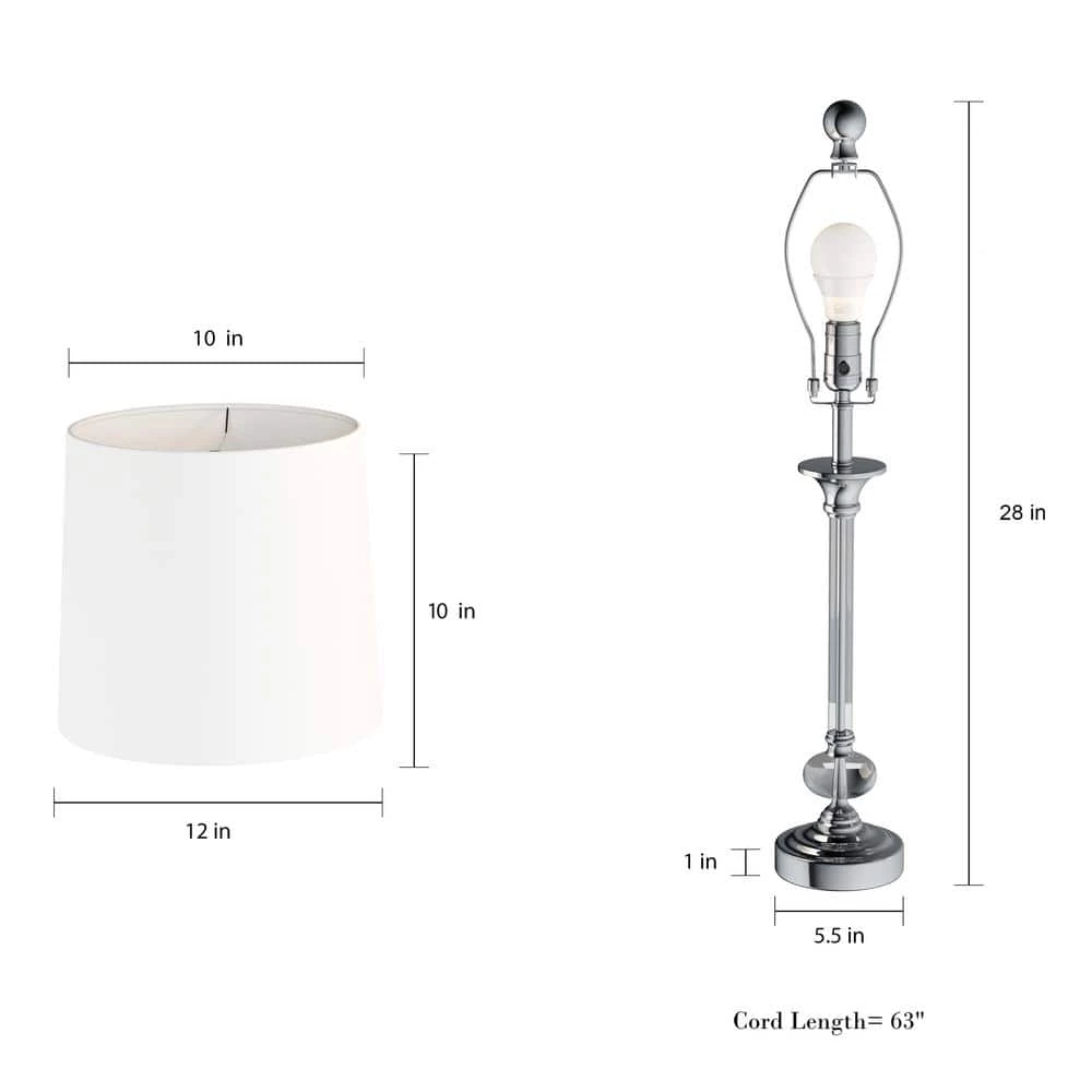 - PRODUCT DETAILS- Materials: Lamp Base and Stem-Metal and clear Acrylic, Shade-Polyester/Cotton blend. 2 Table Lamp Dimensions: (L)12″x (W)12″x (H)28″. Shade color: Ivory. Set of 2. LED light bulbs included.