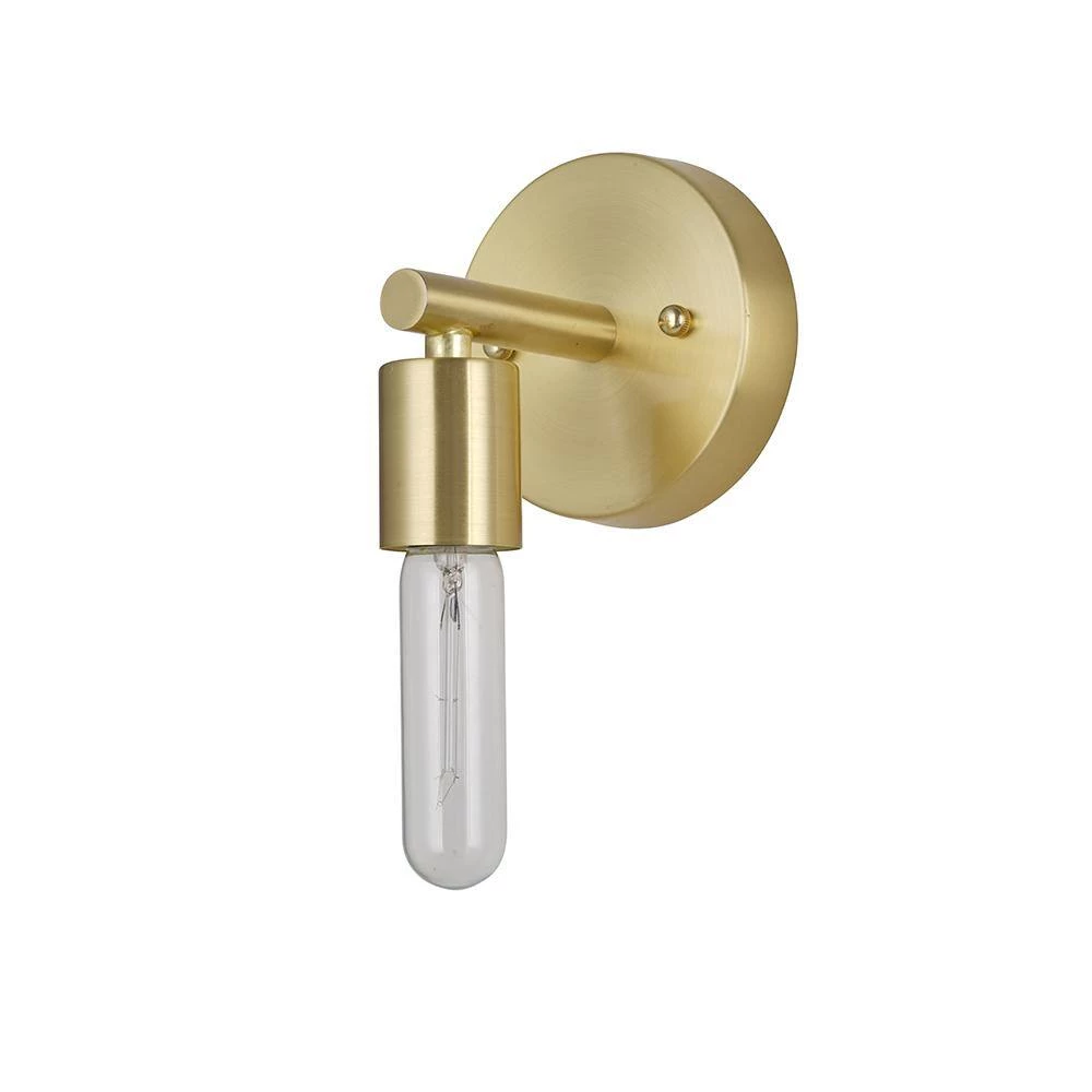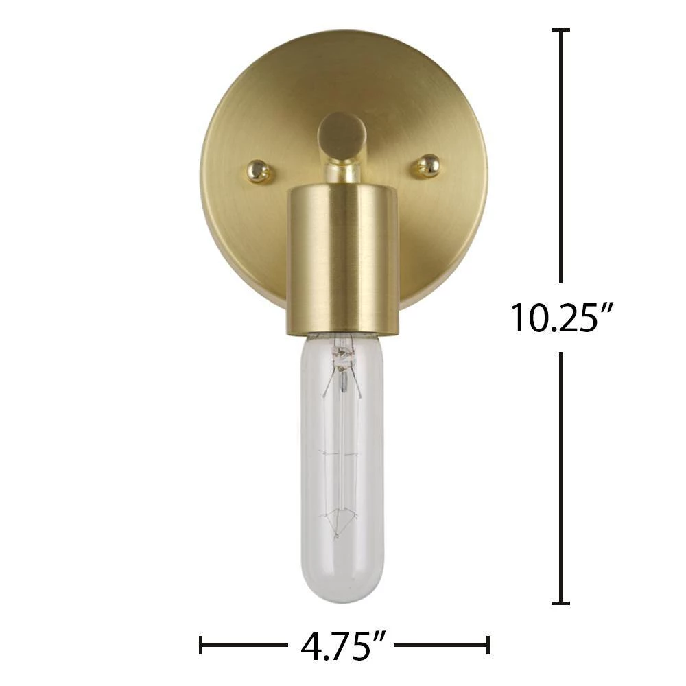 Add personality to your home decor with this mid-century-modern wall sconce. With its satin-brass finish, this fixture complements a variety of home-decor styles, including modern, vintage and industrial. No shade is needed, as the decorative bulb makes a statement of its own. Assembled Dimensions: 5.25 in. W x 4.75 in. D x 4.75 in. H. No shade as the elongated decorative LED vintage bulb makes a statement of it’s own. Mid-century-modern metal wall sconce in a satin-brass finish. 1 clear decorative LED bulb included. Not rated for wet or damp locations.