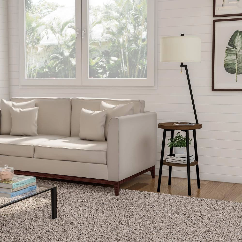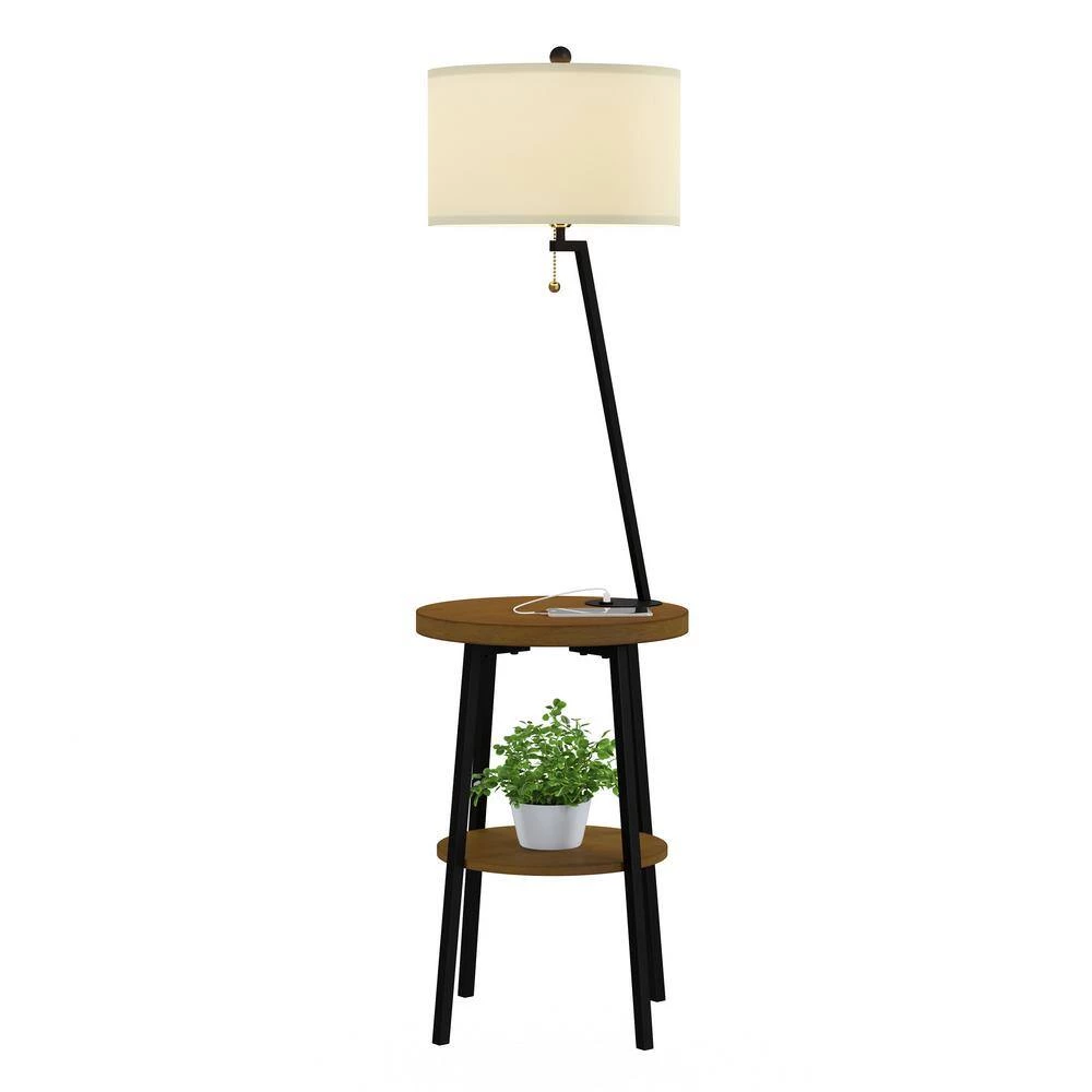 Bring contemporary charm to your home with the space saving Floor Lamp End Table by Lavish Home! Blending the minimalist aesthetic of mid-century modern style and streamlined functionality, this versatile lamp features rustic veneer manufactured wood, arched black iron metal with a uniquely-designed drum shaped lamp shade. The UL listed lamp provides the convenience of a built-in USB port for charging cell phones or tablets and comes with a replaceable energy-saving LED 9W E26 type light bulb (60-watt incandescent equivalent) with a 25,000-hour life span. This sturdy side table and floor lamp in one will brighten any room while providing functional storage for knick-knacks, photo frames, laptops or other home decor.