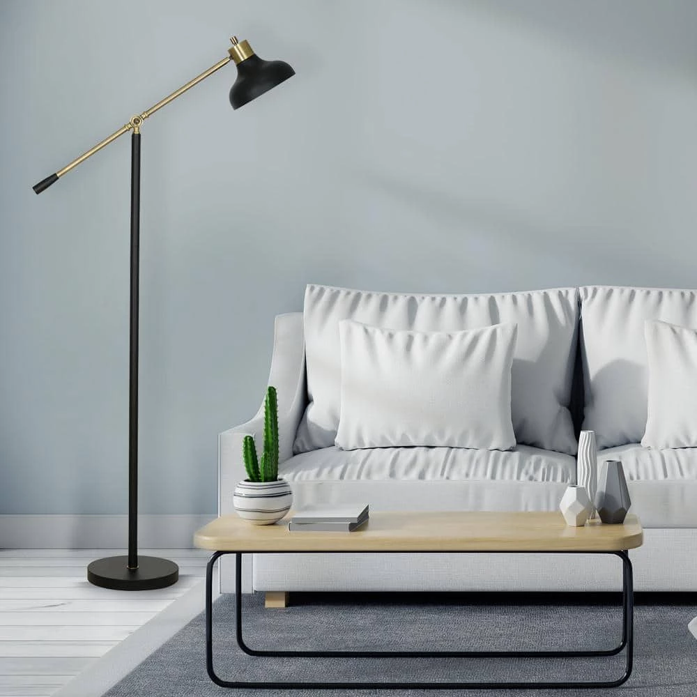 This 59.125 in. mid-century modern metal floor lamp features a counterbalance design with a matte black finish and gold accents. The adjustable shade and modern design make this the perfect addition to any room in your home.