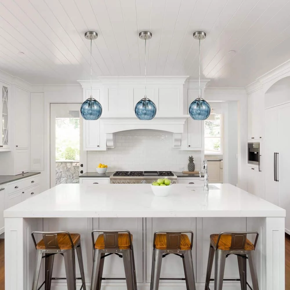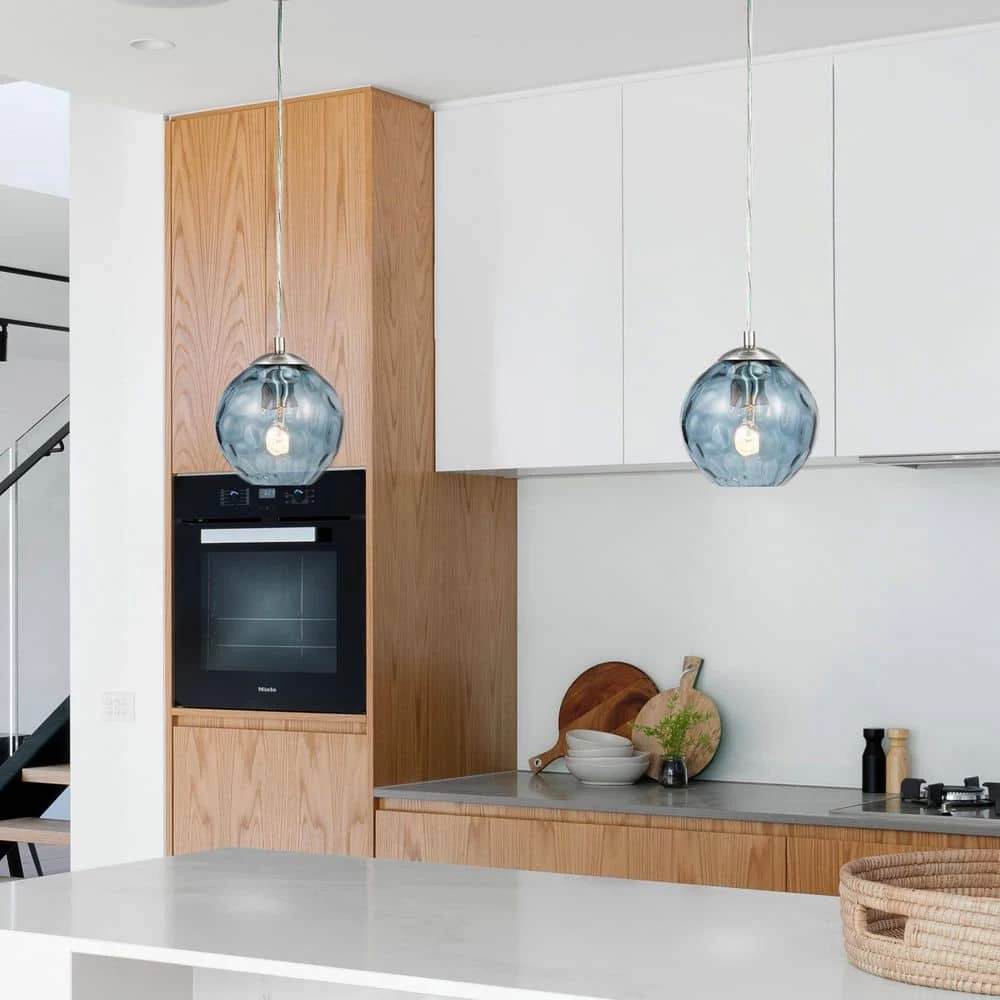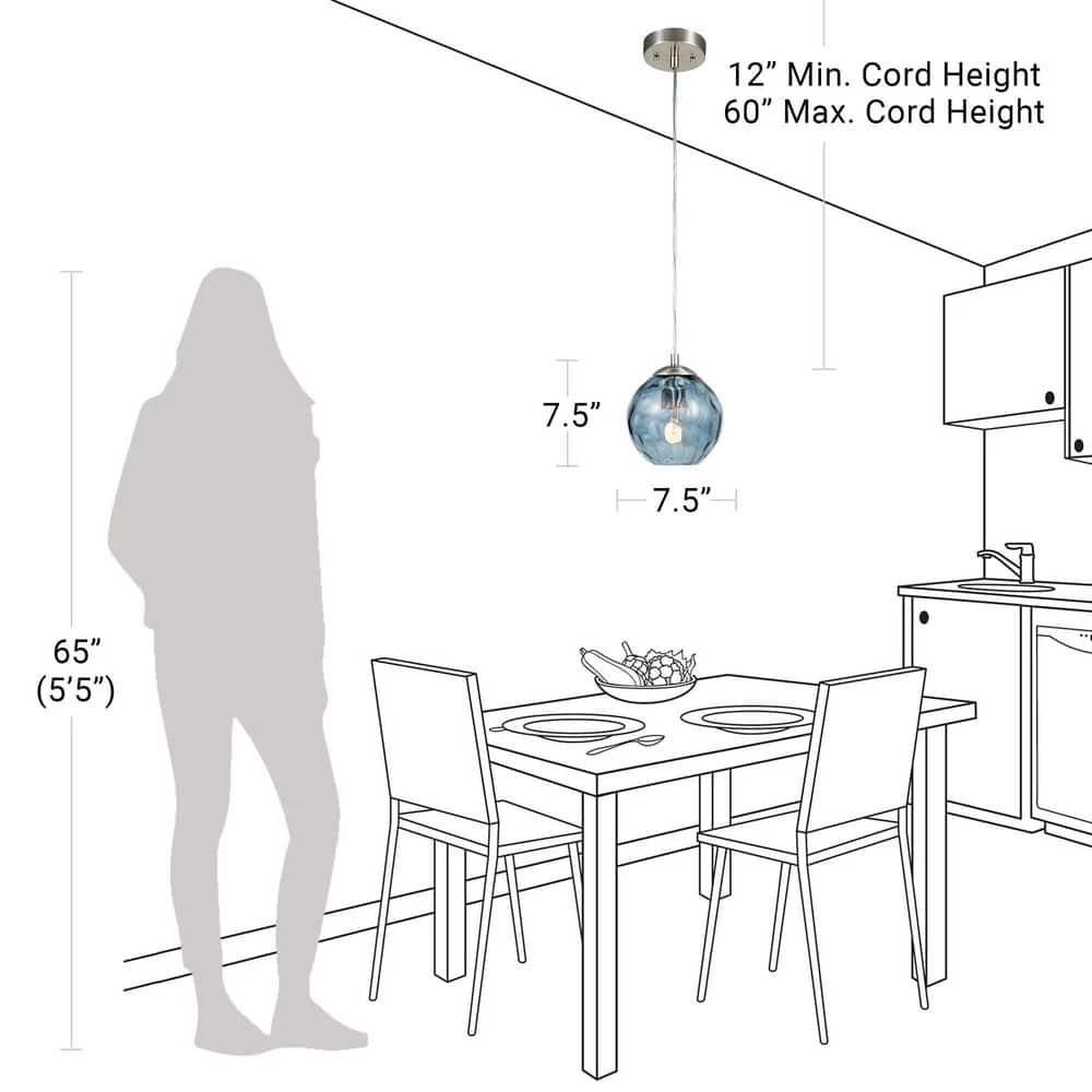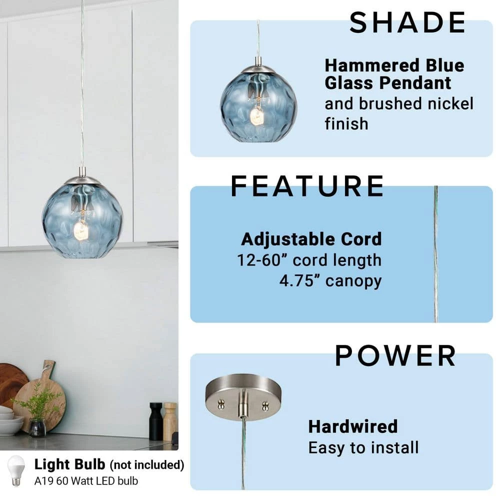Illuminate your room with this blue glass mini pendant light. This light will make a contemporary statement and add a pop of color to your decor with a trendy blue glass hammered shade and brushed steel accents. The brushed steel metal canopy mounts to any standard ceiling junction box using the included mounting hardware. This versatile pendant is ideal to hang as a series of three over kitchen island, a set of two over bedside tables and alone over a small dining table or kitchen sink.