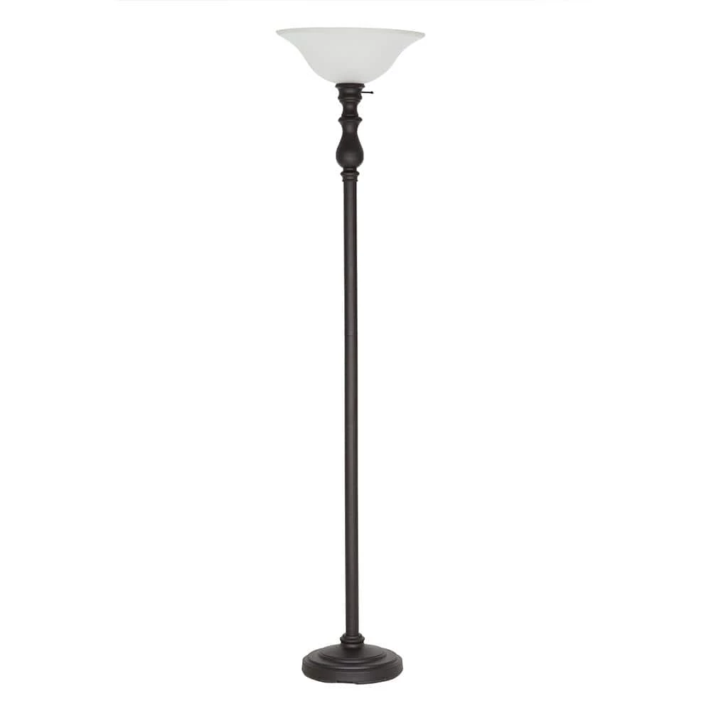 Traditional style and frosted glass give it a vintage look. Painted bronze floor lamp with frosted glass shade. LED bulb included. Dimensions: 15.75 in. W x 15.75 in. D x 69.75 in. H. Assemble in 15-minutes or less.