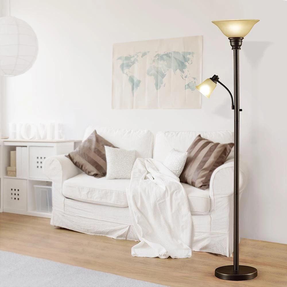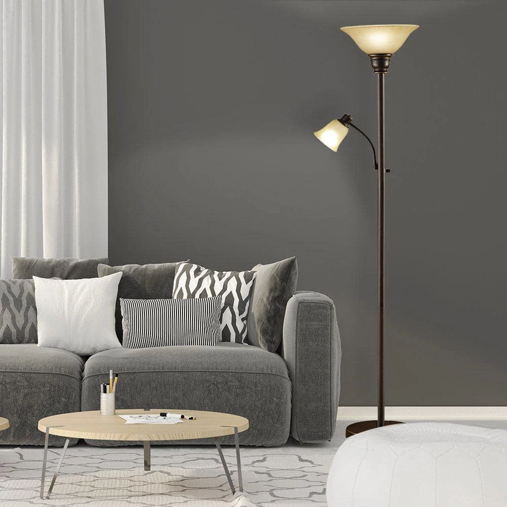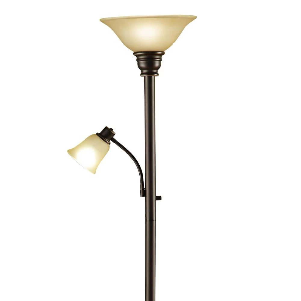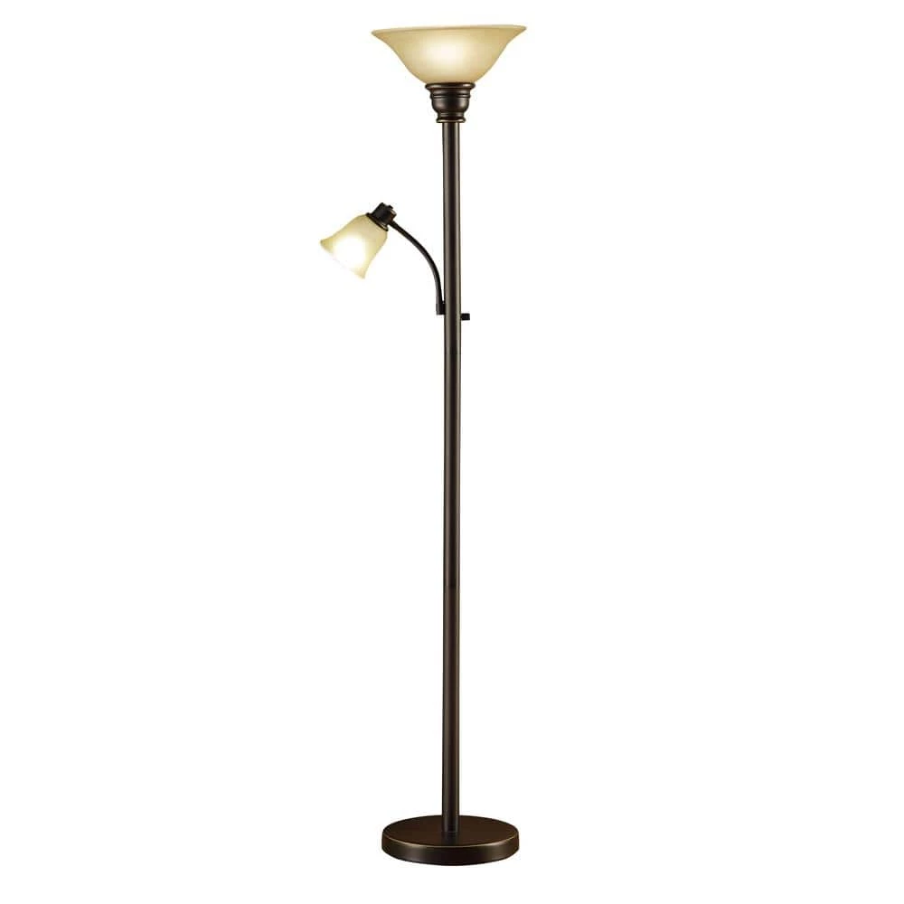 A multi-functional light designed for efficiency. The distinct ‘Mother and Daughter’ Torchiere Floor Lamp illuminates the room generously with Mother’s ambient uplight, while the Daughter task lamp lends adjustable downward focus for reading or craft activities. Fashioned in Oil Rubbed Bronze, this contemporary metal fixture complements a family room, lounge or office wonderfully. Both white plastic shades use a threaded mount. This durable Torchiere Floor Lamp has a simple on/off switch on the back of both amber glass shades. Updating the light fixtures in your home is the most effective way to accomplish an alluring, yet simple, DIY remodel. Producing captivating fixtures for nearly five decades, Catalina Lighting extends a 1-year limited warranty against defects in materials and workmanship.