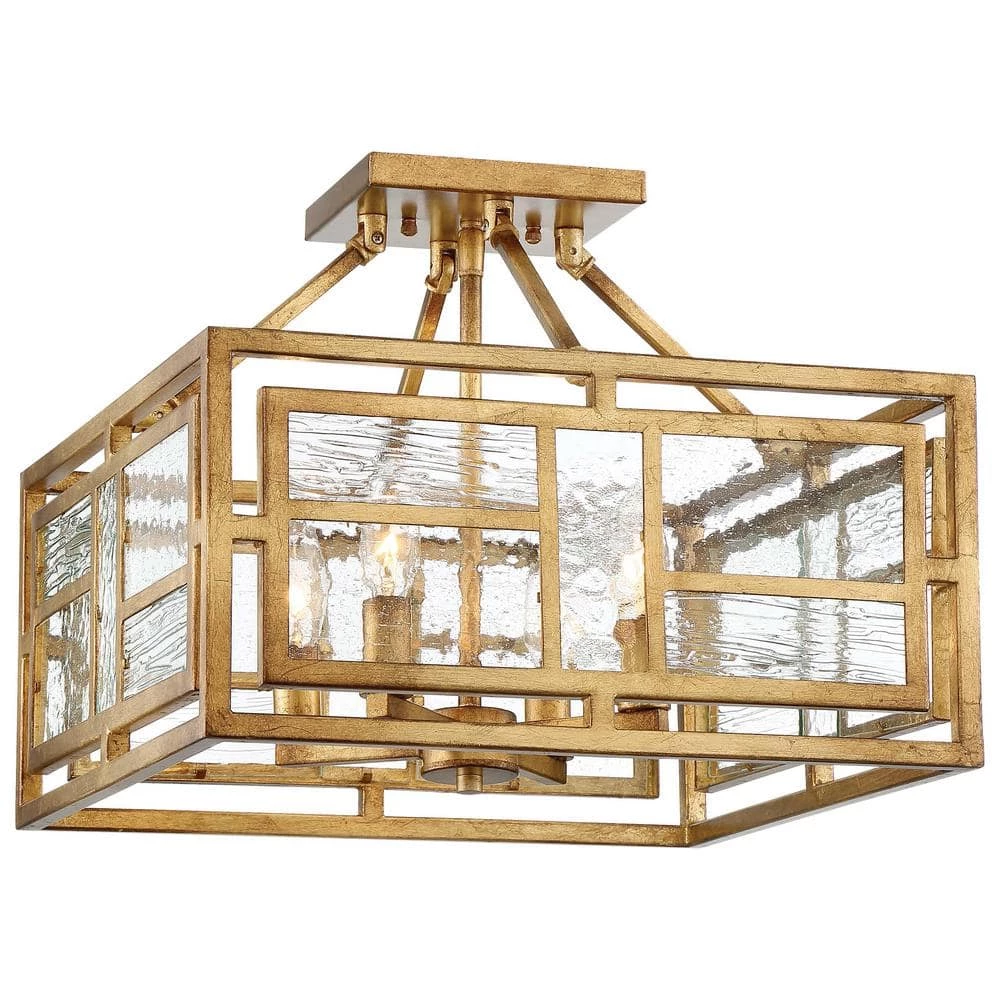 - Featuring a pandora gold leaf finish and a clear textured geometric glass shades