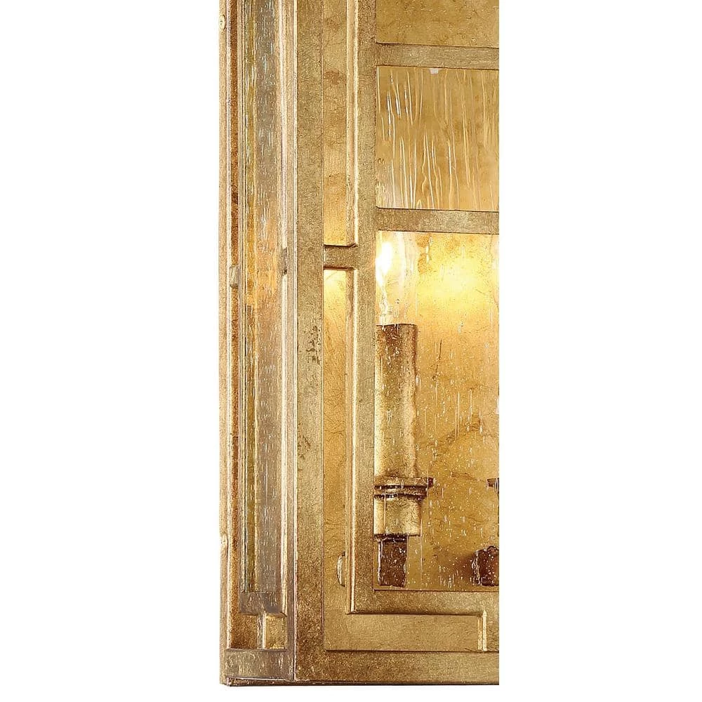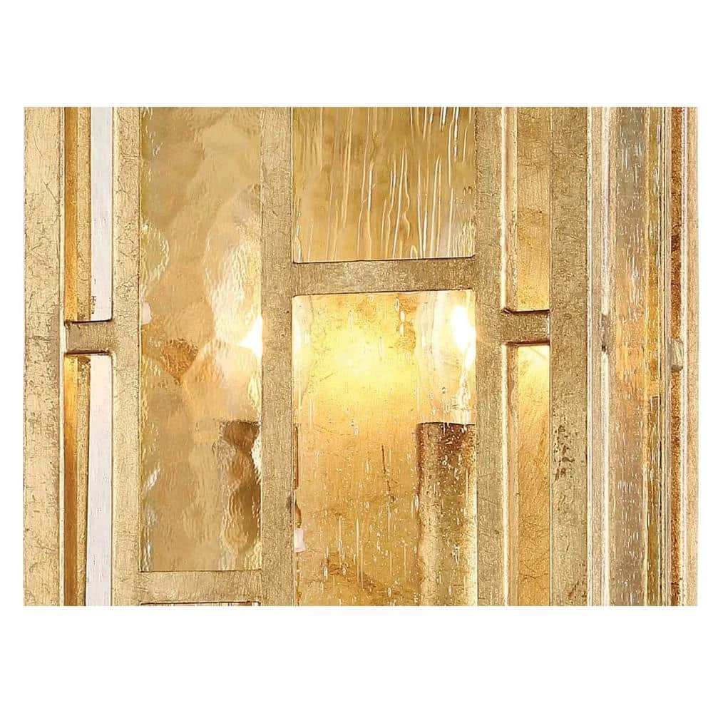 - Featuring a pandora gold leaf finish and a clear textured geometric glass shades