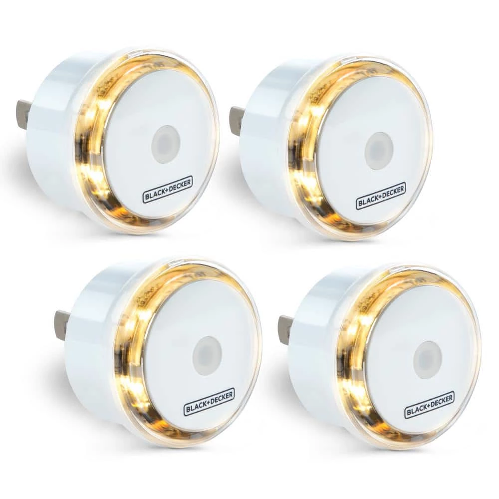 Illuminate any space in your home with this 4-pack of kid and adult night lights for bedrooms, bathrooms and more from BLACK+DECKER, Designed to provide automatic lighting in dark conditions, this night light features a photocell sensor with 2.5 Lumens to ensure any room is bright when you need it, regardless of the time of day. Our electric plug night lights are the fast, essential way to bring light where you need it when you need it. Featuring a 1-of-a-kind ring light, these plug in nightlights for adults and kids have a small, compact design that will not take up too much space. Each wall light will use only 1 socket on any outlet, leaving the second free for other devices in your home. They will never get in the way of your day-to-day activities. Plus, with the auto On/Off, you won’t have to worry about this night light wasting energy when you don’t need it. At Black plus Decker, we have made it our mission to provide high-quality household products and wall plug night lights that suit the needs of our customers. We have earned a reputation for quality, ingenuity and value that you can depend on. Our ETL-certified night lights are the perfect way to automatically illuminate any space in dark conditions. Light up your house with the Black plus Decker Night Light 4-Pack, Product Details: (4) Photocell Sensor Night Lights.