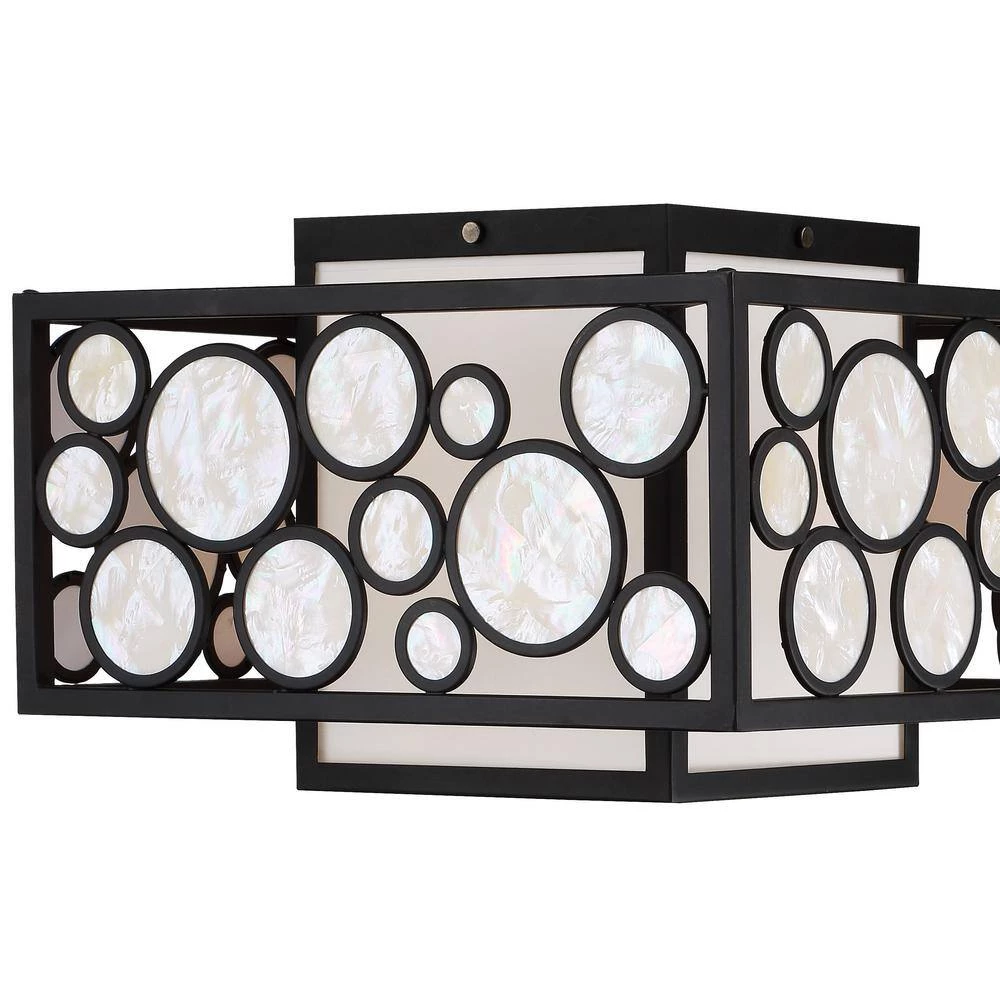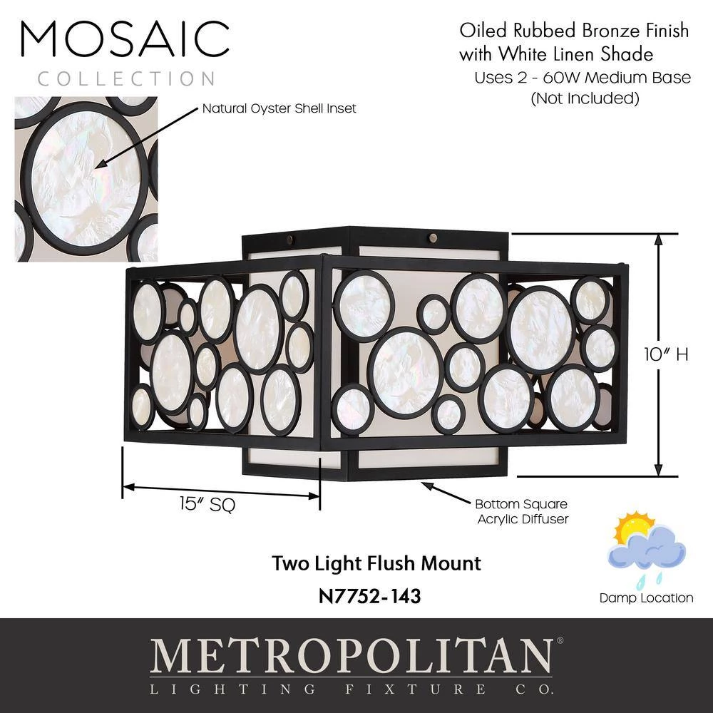Natural Mother of Pearl shells provide a fascinating and chic aesthetic to the Mosaic family. The Mosaic Collection designed by Metropolitan Lighting adds sophistication and elegance to any room. Oil Rubbed Bronze finish with circles of White Shell material and white linen shades intertwine together in each fixture brings nothing but beauty for years to come. Designed in five different shapes and styles consisting of 2-light pendant, 4-light pendant, 4-light island chandelier, 2-light flush mount, and 1-light wall sconce. With this collection, you can satisfy your indoor lighting needs and dreams. Mosaic, truly another fine collection by Metropolitan Lighting.