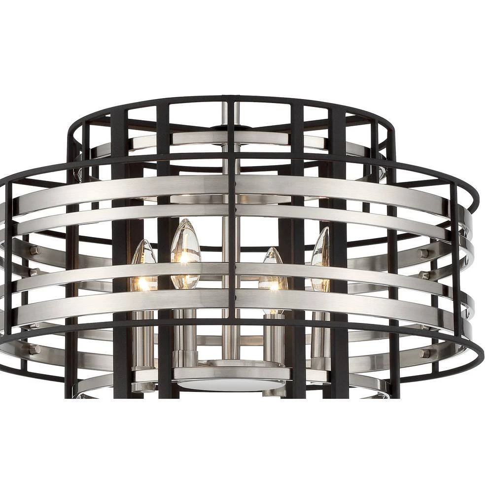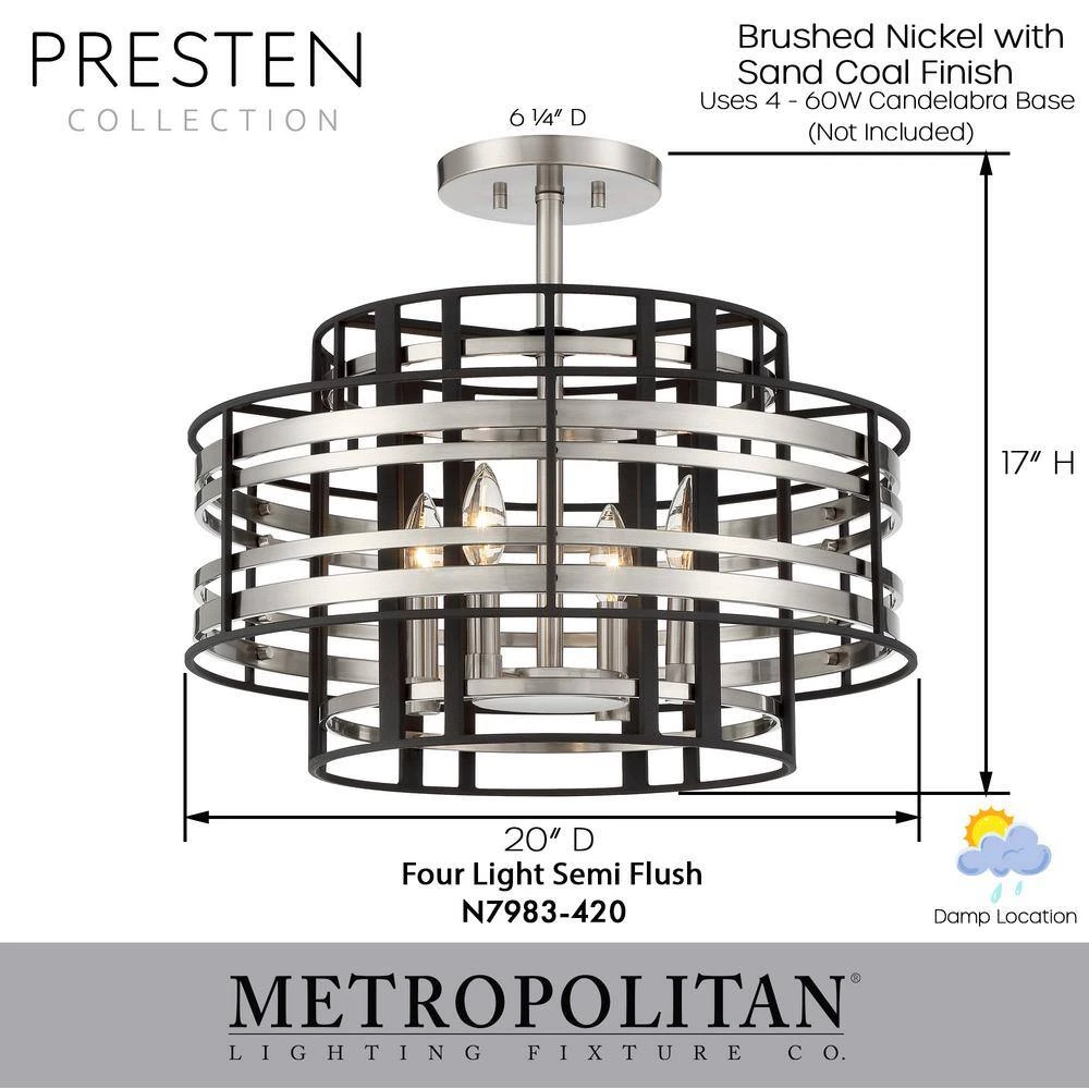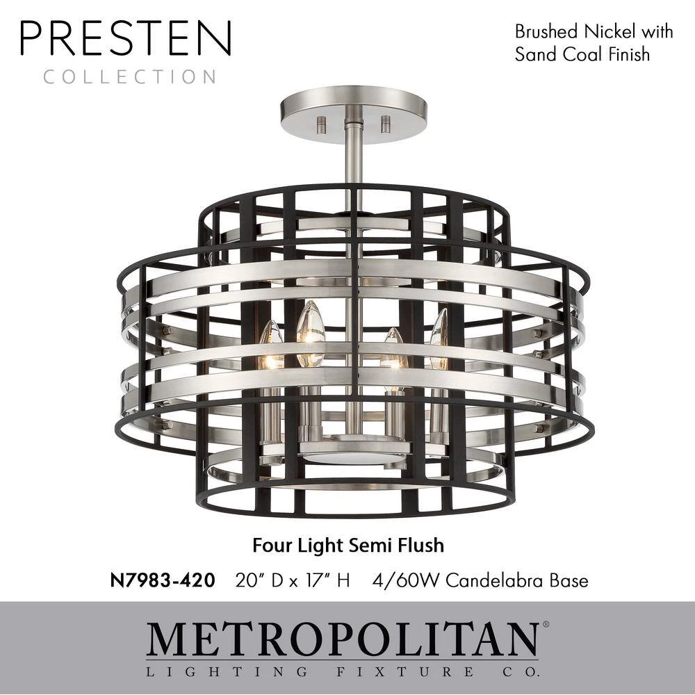 The Presten Collection designed by Metropolitan Lighting adds sophistication and style with a bold and edgy appearance. Brushed Nickel bands layered inside Sand Coal frames bring a dynamic look to any space. 6 different shapes and designs consisting of 1-light mini-pendant, 4-light pendant, 6-light pendant, 4-light semi flush, 8-light island chandelier and 2-light wall sconce. With this collection, you can satisfy your indoor lighting needs. Solid durable steel construction intertwine together with candelabra-based bulbs brings nothing but refinement and elegance to your home or office. Presten, truly another fine collection by Metropolitan Lighting.