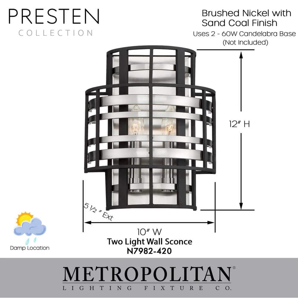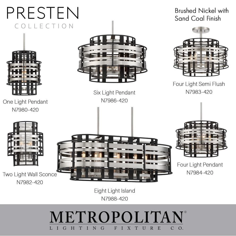 The Presten Collection designed by Metropolitan Lighting adds sophistication and style with a bold and edgy appearance. Brushed Nickel bands layered inside Sand Coal frames bring a dynamic look to any space. 6 different shapes and designs consisting of 1-light mini-pendant, 4-light pendant, 6-light pendant, 4-light semi flush, 8-light island chandelier and 2-light wall sconce. With this collection, you can satisfy your indoor lighting needs. Solid durable steel construction intertwine together with candelabra-based bulbs brings nothing but refinement and elegance to your home or office. Presten, truly another fine collection by Metropolitan Lighting.