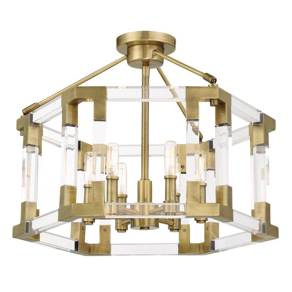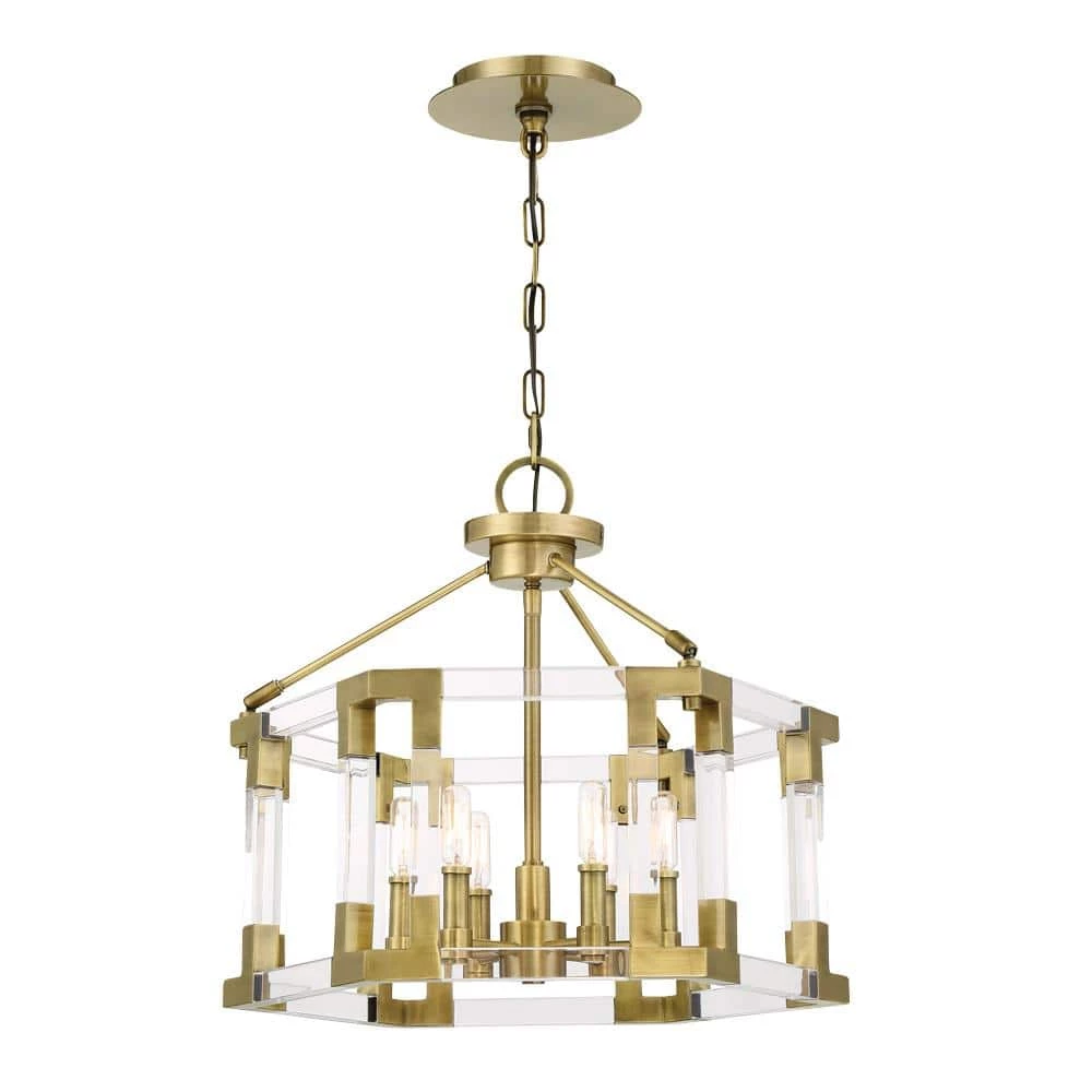 Glamourous addition to a foyer or living room, Prima Vista features an Aged Antique Brass finish. Clear Acrylic supports the geometric frames for a contemporary look. The Prima Vista Collection by Metropolitan Lighting, is designed in nine different chandelier, pendant, wall sconce, and semi flush configurations which will accommodate your home decor needs and wants. The chandeliers are engineered to allow adjustable hanging height up to 144 in. Prima Vista Collection, designed by Metropolitan Lighting, will add elegance and beauty to your home.