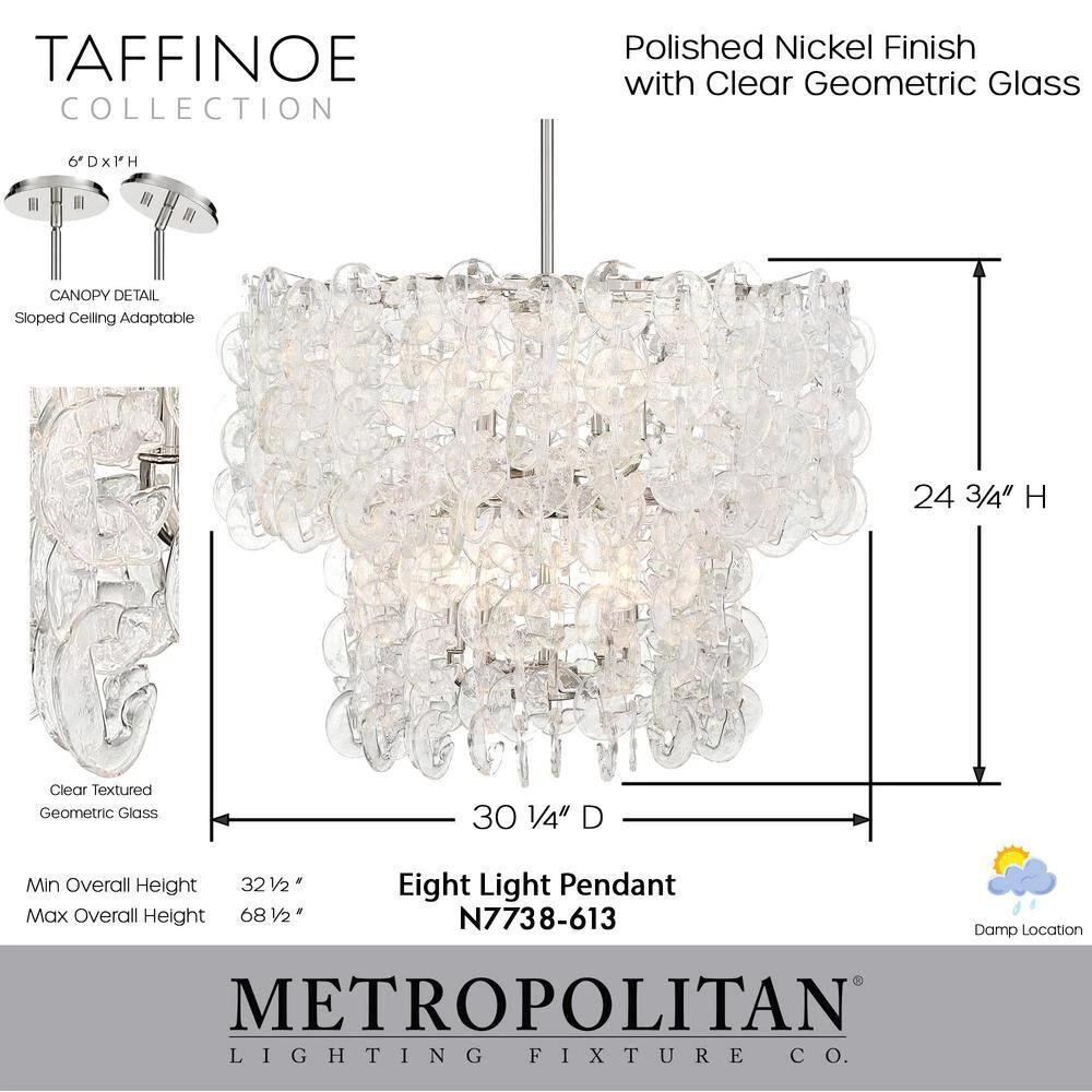 Clear glass geometry cascades against a Polished Nickel frame to transform light into a glimmering work of art. Our pendant collection, Taffinoe, by Metropolitan Lighting is configured in 2 different designs which will gratify your home decor needs and wants. Engineered to allow adjustable hanging height up to 36 in. The Taffinoe Collection, designed by Metropolitan Lighting, transfigures light into a shimmering and shining work of art.